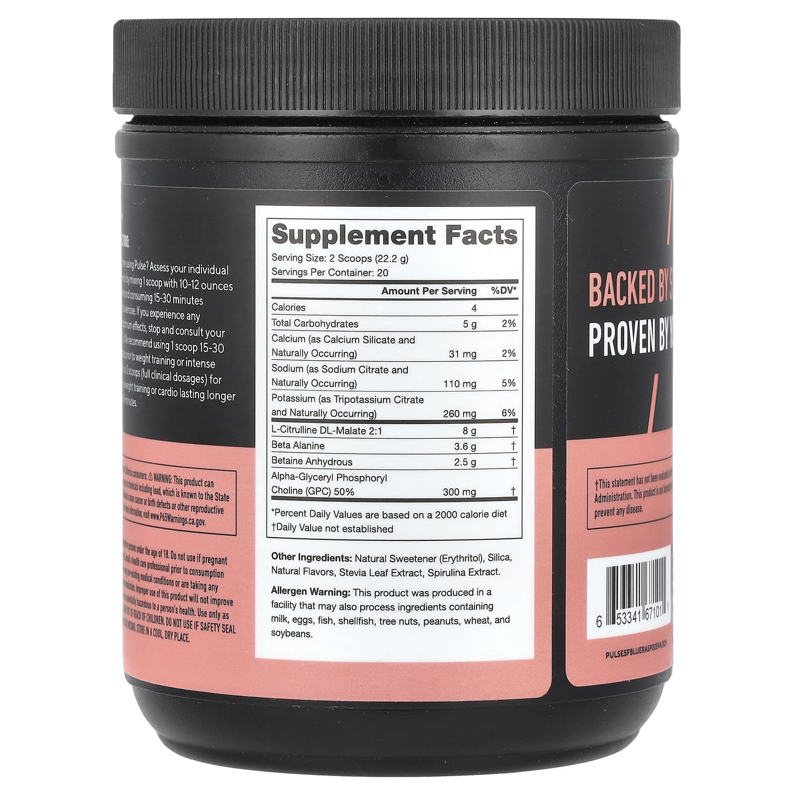 Впервые пользуетесь Pulse? Оцените свою переносимость, смешав 1 мерную ложку с 10–12 унциями воды и выпив за 15–30 минут до тренировки. Если вы почувствуете какие-либо неоптимальные эффекты, прекратите прием и обратитесь к врачу. Мы рекомендуем принимать по 1 мерной ложке за 15–30 минут до силовой тренировки или интенсивной кардиотренировки, или 2 мерные ложки (в полной клинической дозировке) для интенсивных силовых тренировок или кардиотренировок продолжительностью более 45 минут.