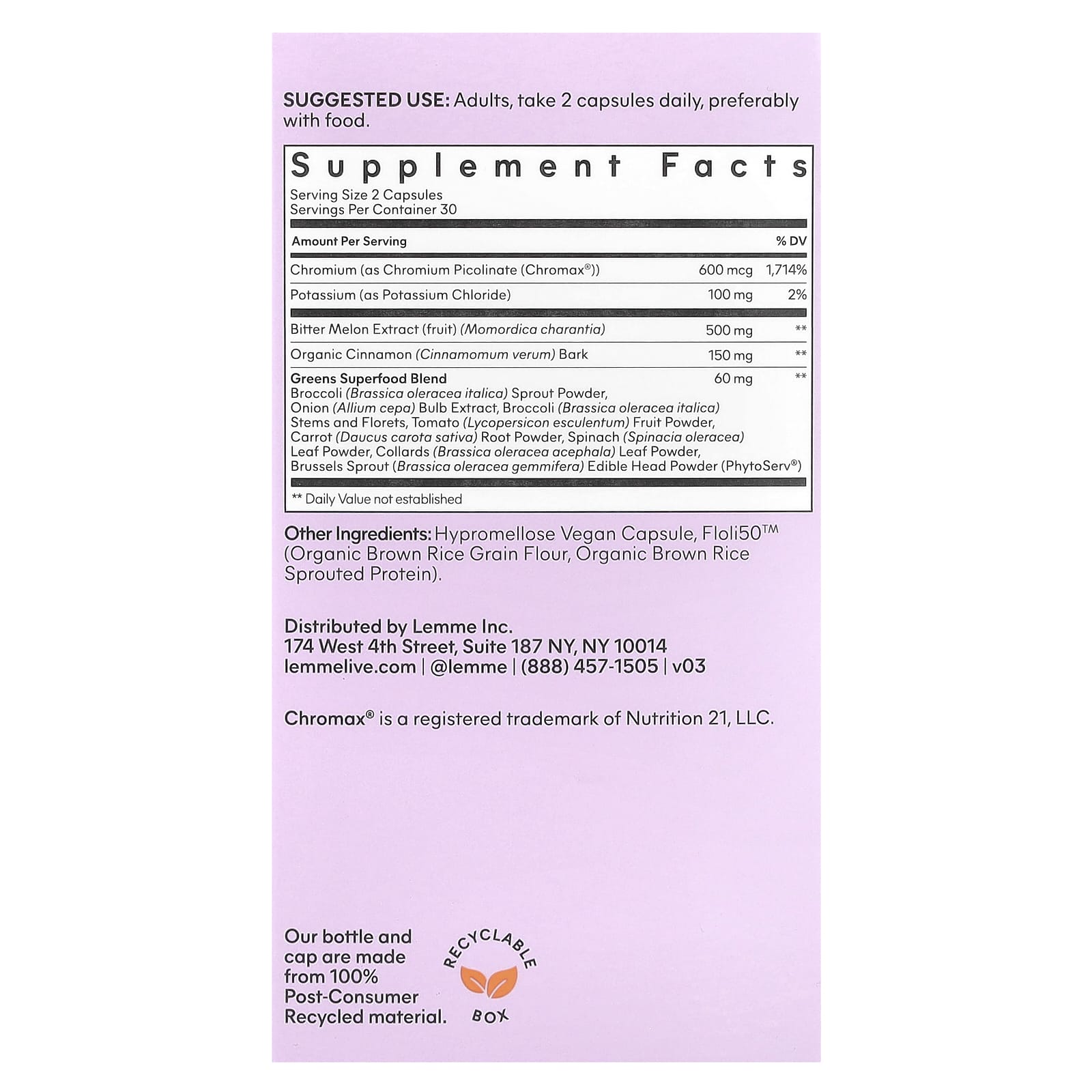 Управляйте своей жаждой и поддерживайте здоровый уровень сахара в крови † с помощью клинически изученного хрома, горькой дыни, корицы и смеси суперпродуктов с зеленью.