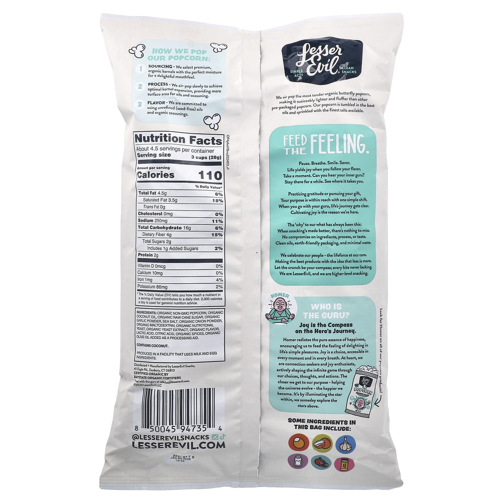 Органический попкорн без ГМО, органическое кокосовое масло, органический необработанный тростниковый сахар, органический чесночный порошок, морская соль, органический луковый порошок, органический мальтодекстрин, органические пищевые дрожжи, экстракт органических дрожжей, органический ароматизатор, молочная кислота, лимонная кислота, органические специи, органическое оливковое масло добавлено в качестве технологической добавки.