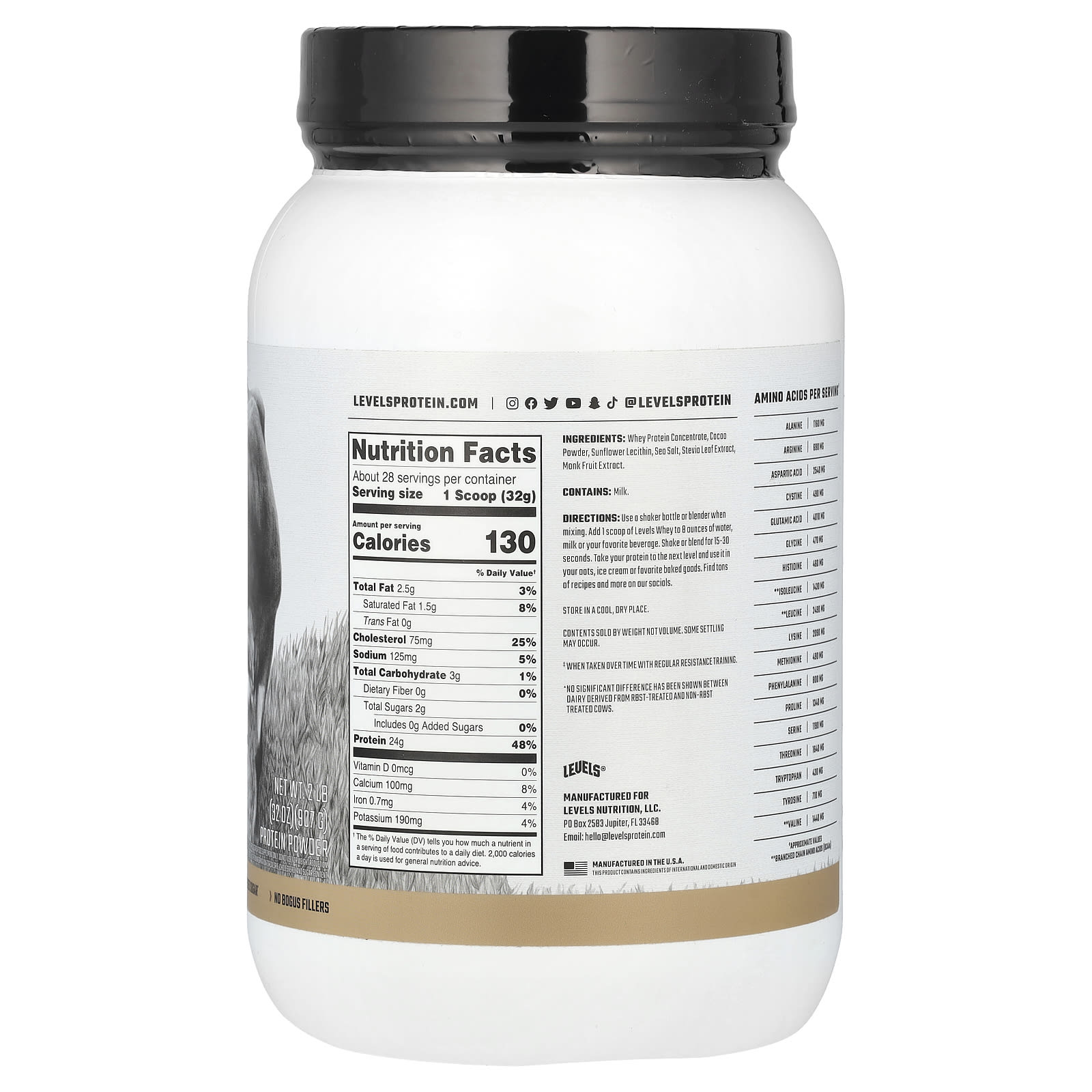 Качественное молоко вкуснее, намного лучше. Вот почему мы выбираем молочные продукты травяного откорма без гормонов ^, чтобы сделать наш концентрат сывороточного протеина. Концентрат сыворотки - это наименее переработанная форма сыворотки, что означает, что он богат высококачественным полноценным белком и незаменимыми аминокислотами. Каждая партия сыворотки Levels® Whey проходит микрофильтрацию холодным способом и смешивается с подсолнечным лецитином. Здесь вы также не найдете обмана. Это означает отсутствие сои, глютена, искусственных ароматизаторов и подсластителей.