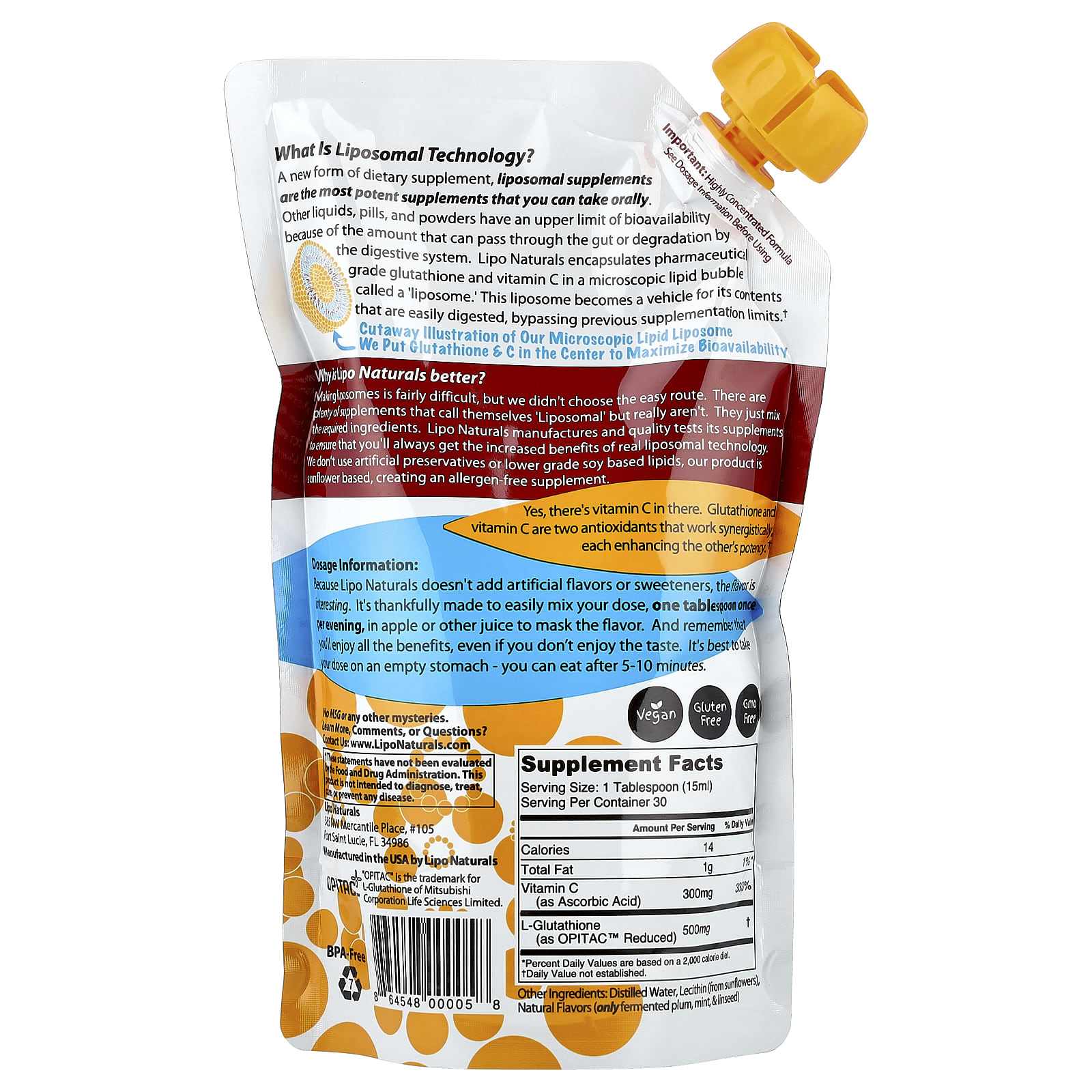 Липосомальные добавки — это новая, более эффективная форма пищевых добавок, которые можно принимать перорально. Другие жидкие формы добавок, таблетки и порошки имеют ограниченную биодоступность из-за количества вещества, которое может пройти через кишечник, или расщепления, происходящего в пищеварительной системе. Lipo Naturals инкапсулирует глутатион и витамин C фармацевтической степени чистоты в крошечный липидный пузырёк, называемый «липосомой». Такая липосома становится носителем для своего содержимого, которое легко переваривается, минуя предыдущие ограничения приёма добавок.