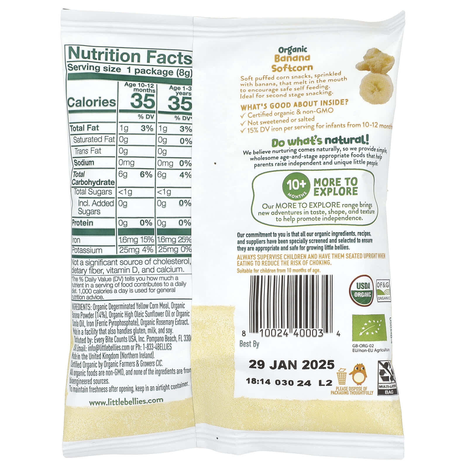 Органическая дегтяренная мука из желтой кукурузы, органический банановый порошок (14%), органическое высокоолеиновое подсолнечное масло или органическое рапсовое масло, железо (пирофосфат железа), экстракт органического розмарина