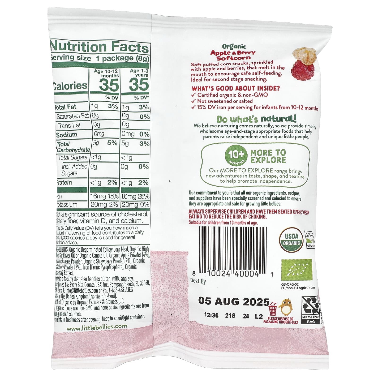 Органическая дегтяренная мука из желтой кукурузы, органическое высокоолеиновое подсолнечное масло или органическое рапсовое масло, органический яблочный порошок (4%), органический банановый порошок, органический клубничный порошок (2%), органический малиновый порошок (2%), железо (пирофосфат железа), экстракт органического розмарина