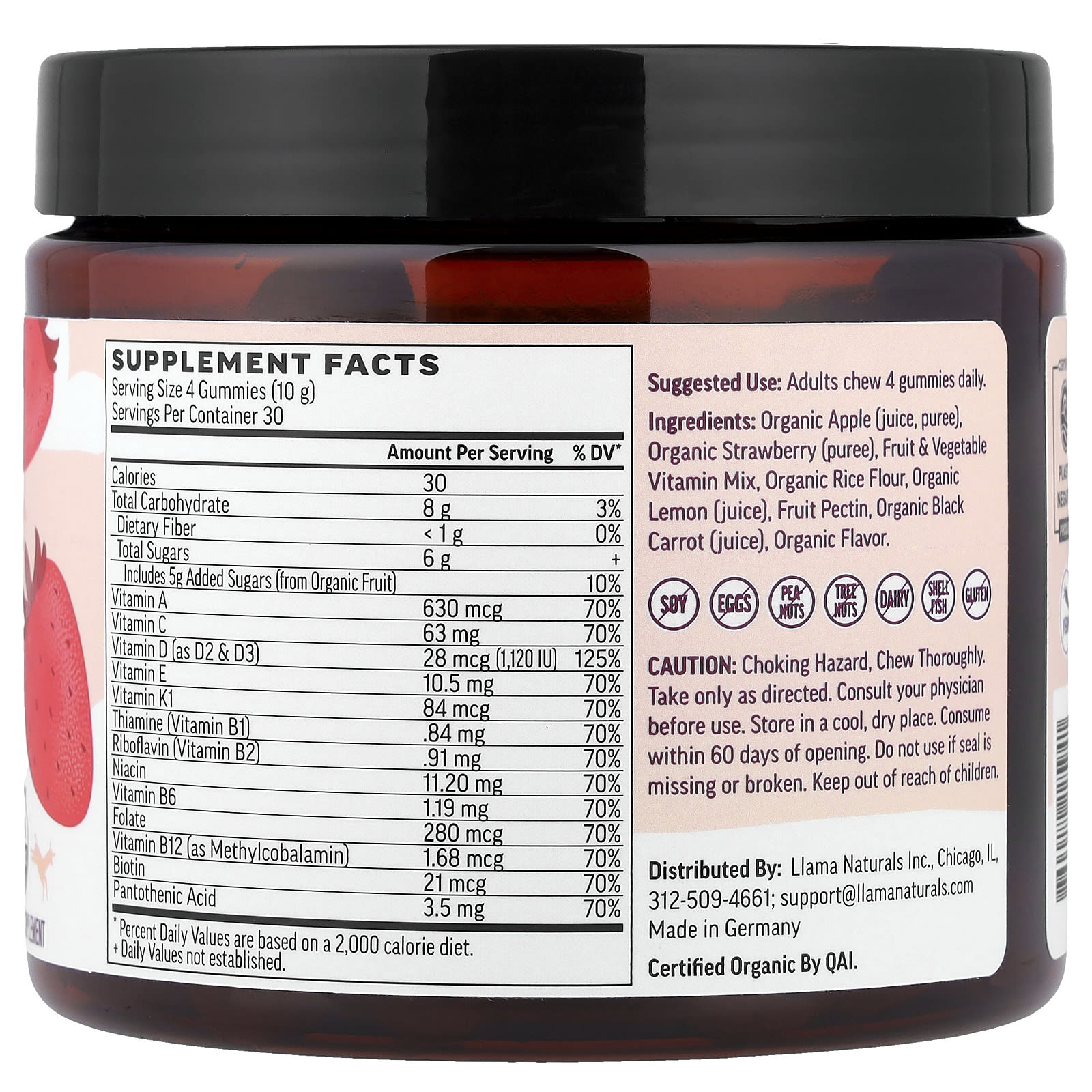 Органическое яблоко (сок, пюре), органический клубничный (пюре), фрукты и овощи смесь растительных витаминов, органическая рисовая мука, органический лимонный сок, фруктовый пектин, органическая черная морковь (сок), органический ароматизатор.