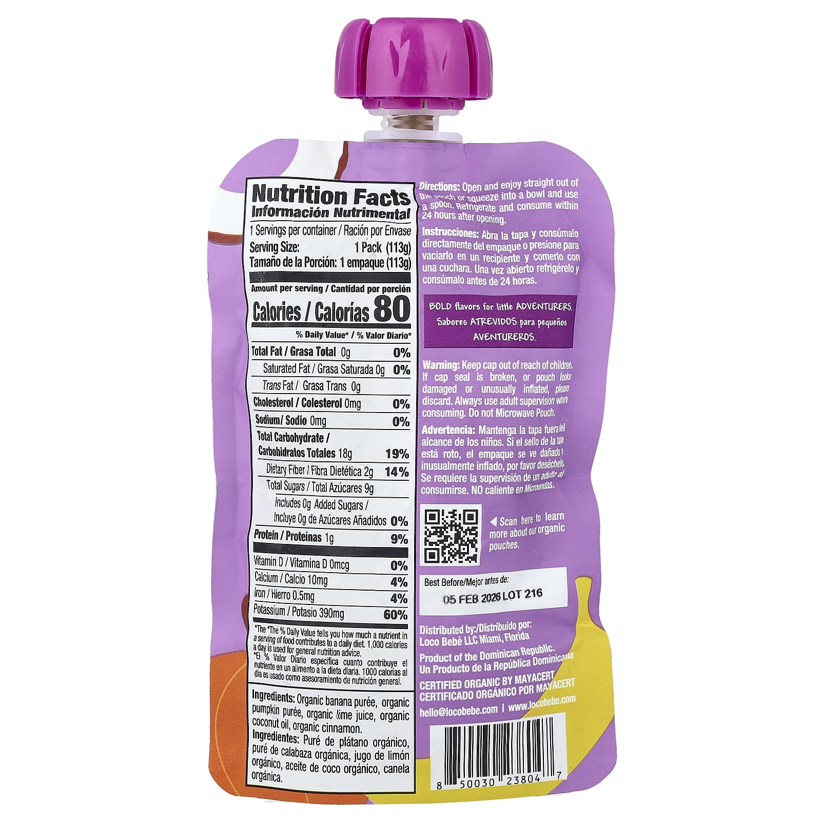 Органическое банановое пюре, пюре из органической тыквы, органический сок лайма, органическое кокосовое масло, органическая корица.
