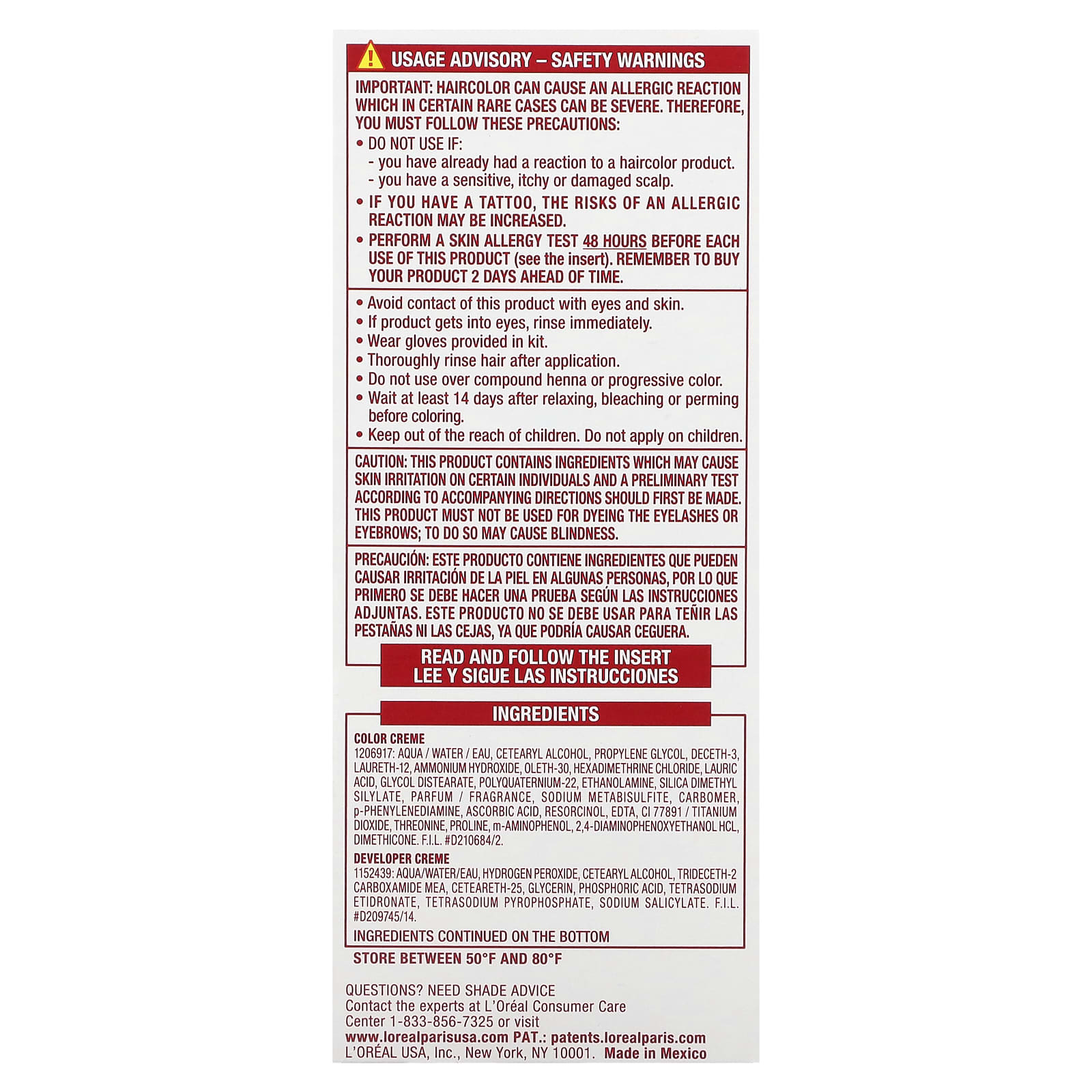 Этот продукт содержит ингредиенты, которые могут вызывать у некоторых людей раздражение кожи. Перед первым применением проверьте наличие аллергической реакции согласно прилагаемой инструкции. Не используйте данный продукт для окрашивания бровей и ресниц, поскольку это может привести к потере зрения. Внимательно прочитайте и следуйте указаниям на вкладыше.