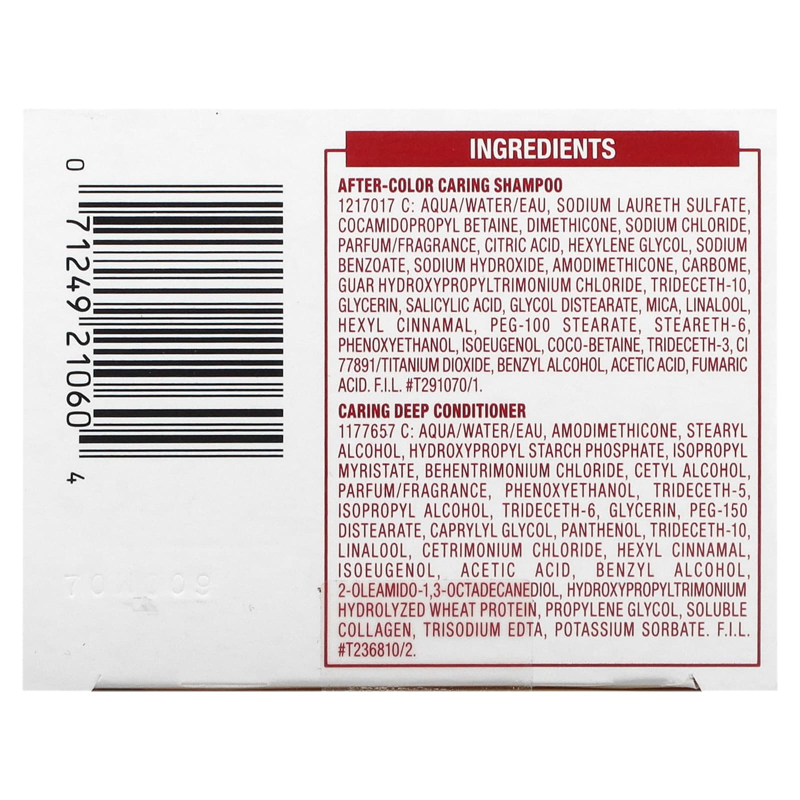 Ухаживающий шампунь после окрашивания: Вода, лауретсульфат натрия, кокамидопропилбетаин, диметикон, хлорид натрия, парфюмерная композиция/отдушка, лимонная кислота, гексиленгликоль, бензоат натрия, гидроксид натрия, амодиметикон, карбом, гуар гидроксипропилтримония хлорид, тридецет-10, глицерин, салициловой кислоты, гликоль дистеарат, слюда, линалоол, гексил циннамал, ПЭГ-100 стеарат, стеарет-6, феноксиэтанол, изоэвгенол, коко-бетаин, тридецет-3, CI 77891/диоксид титана, бензиловый спирт, уксусная кислота, фумаровая кислота