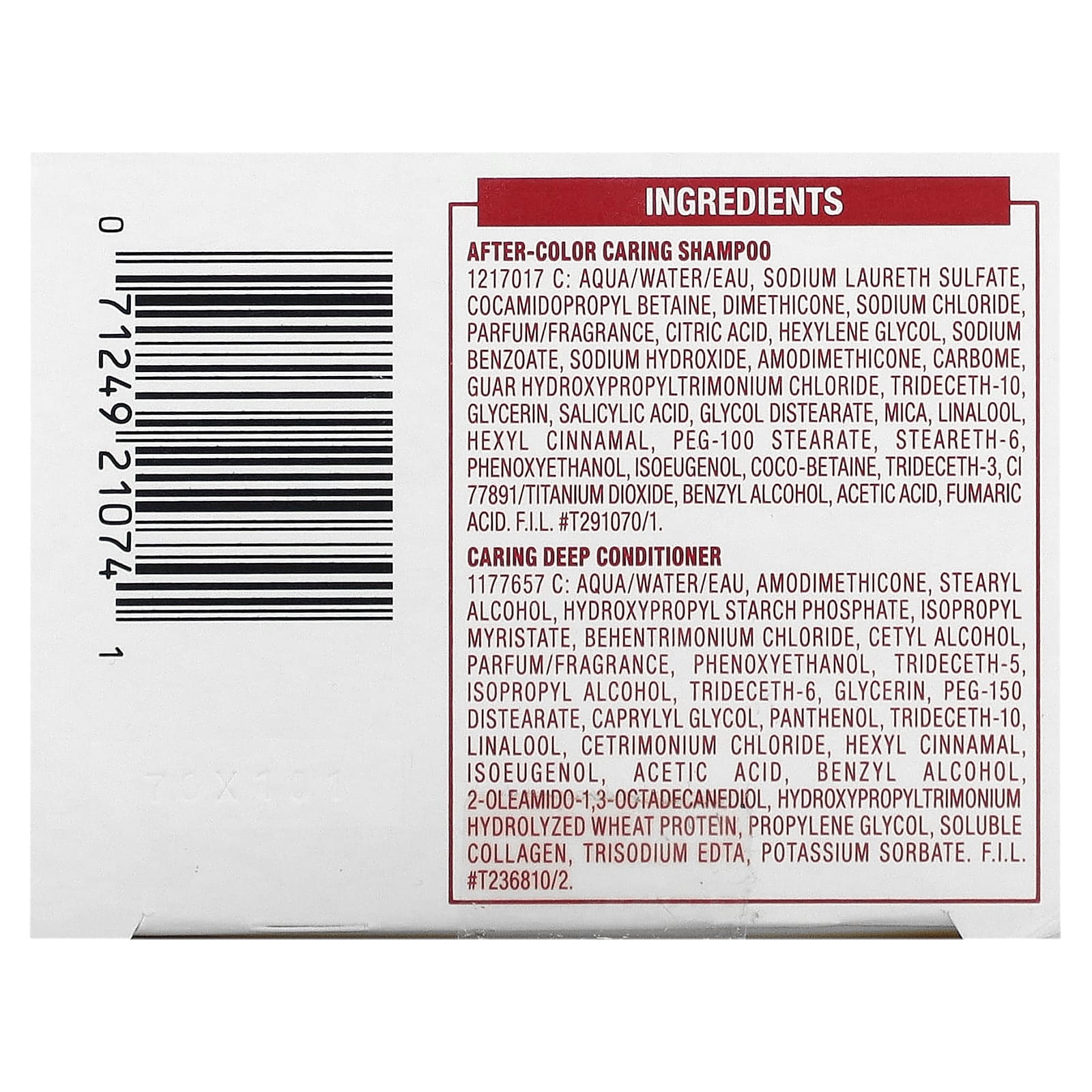 Ухаживающий шампунь после окрашивания: Вода (Aqua/eau), лауретсульфат натрия, кокамидопропилбетаин, диметикон, хлорид натрия, парфюмерная композиция/отдушка, лимонная кислота, гексиленгликоль, бензоат натрия, гидроксид натрия, амодиметикон, карбом, гуар гидроксипропилтримония хлорид, тридецет-10, глицерин, салициловой кислоты, гликоль дистеарат, слюда, линалоол, гексил циннамал, ПЭГ-100 стеарат, стеарет-6, феноксиэтанол, изоэвгенол, коко-бетаин, тридецет-3, CI 77891/диоксид титана, бензиловый спирт, уксусная кислота, фумаровый