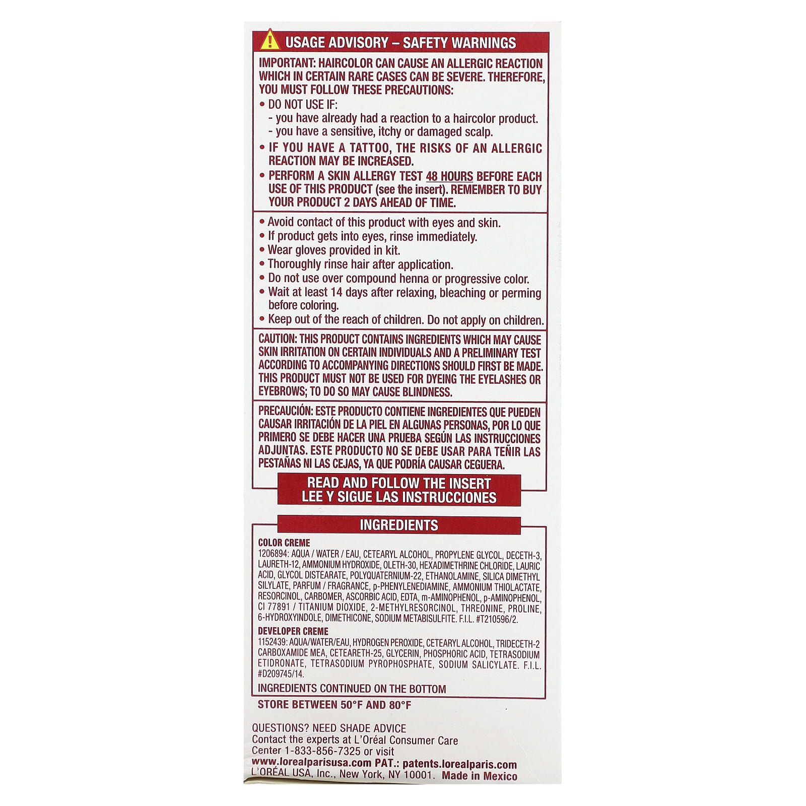 Этот продукт содержит ингредиенты, которые могут вызывать у некоторых людей раздражение кожи. Перед первым применением проверьте наличие аллергической реакции согласно прилагаемой инструкции. Не используйте данный продукт для окрашивания бровей и ресниц, поскольку это может привести к потере зрения.