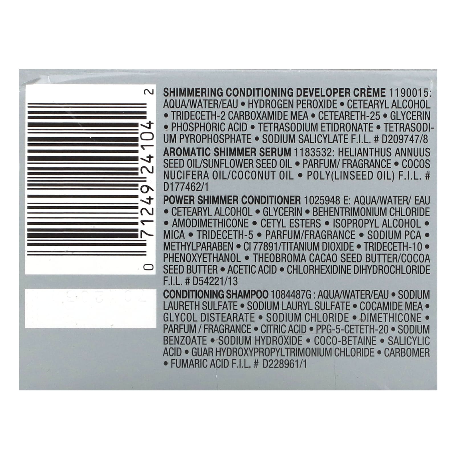 Мерцающий крем-проявитель-кондиционер: Вода (Aqua/eau), перекись водорода, цетеариловый спирт, тридецет-2 карбоксамид МЭА, цетеарет-25, глицерин, фосфорная кислота, тетранатрия этидронат, тетранатрия пирофосфат, салицилат натрия.