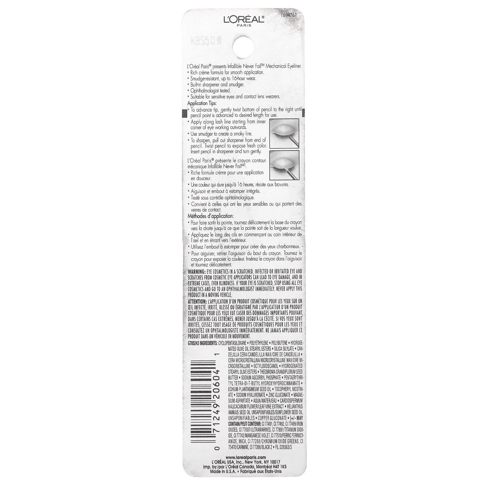 Нанесение косметического средства на поцарапанный, зараженный или раздраженный глаз, а также царапины от аппликатора косметического средства для глаз могут привести к повреждению глаз, а в тяжелых случаях — даже к потере зрения. Если у вас поцарапан глаз, прекратите использование любой косметики для глаз и немедленно обратитесь к офтальмологу. Не используйте в движущемся транспортном средстве.