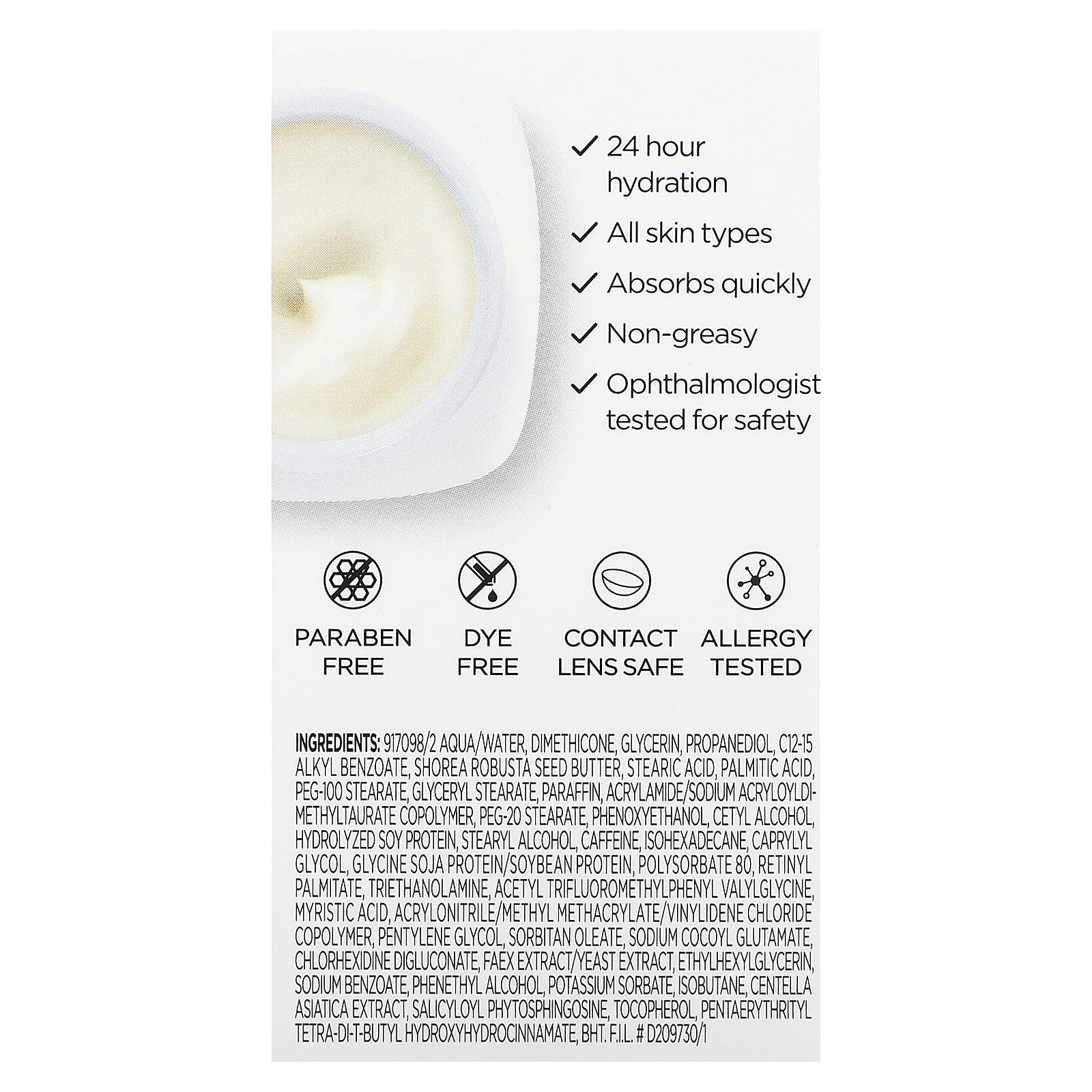 Вода, диметикон, глицерин, пропандиол, c12-15 алкил бензоат, масло салового дерева (Shorea robusta), стеариновая кислота, пальмитиновая кислота, ПЭГ-100 стеарат, глицерил стеарат, парафина, акриламид/натрия акрилоилдиметилтаурат сополимер, ПЭГ-20 стеарат, феноксиэтанол, цетиловый спирт, гидролизованный белок из сои, стеариловый спирт, кофеин, изогексадекан, каприлилгликоль, глицин соевый протеин / соевый протеин, полисорбат 80, ретинилпальмитат, триэтаноламин, ацетил трифторметилфенил валилглицин, миристиновая кислота, акрилонитрил/метилметакрилат/хлорвинилиден сополимер, пентилен гликоль, сорбитанолеат, кокоил глутамат натрия, хлоргексидин диглюконат, экстракт фаекса / дрожжевой экстракт, этилгексилглицерин, бензоат натрия, фенетиловый спирт, сорбат калия, изобутан, экстракт готу колы (Centella asiatica), салицилоил фитосфингозин, токоферол, пентаэритритил тетра-ди-трет-бутил гидроксигидроциннамат, бутилгидрокситолуол.