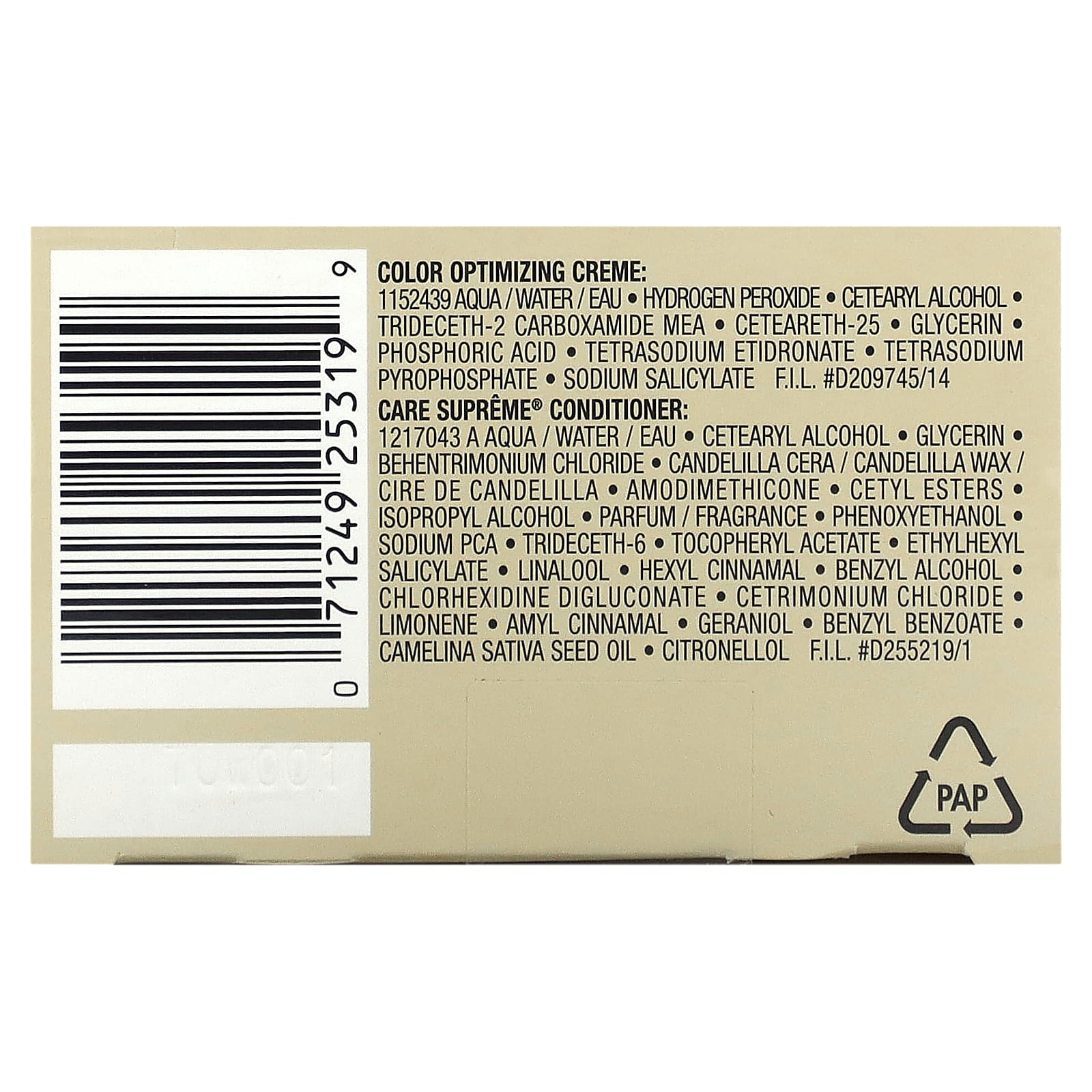 Крем для оптимизации цвета: вода (Aqua), перекись водорода, цетеариловый спирт, тридецет-2 карбоксамид, цетеарет-25, глицерин фосфорная кислота, тетранатрия этидронат, тетранатрия пирофосфат, салицилат натрия.
