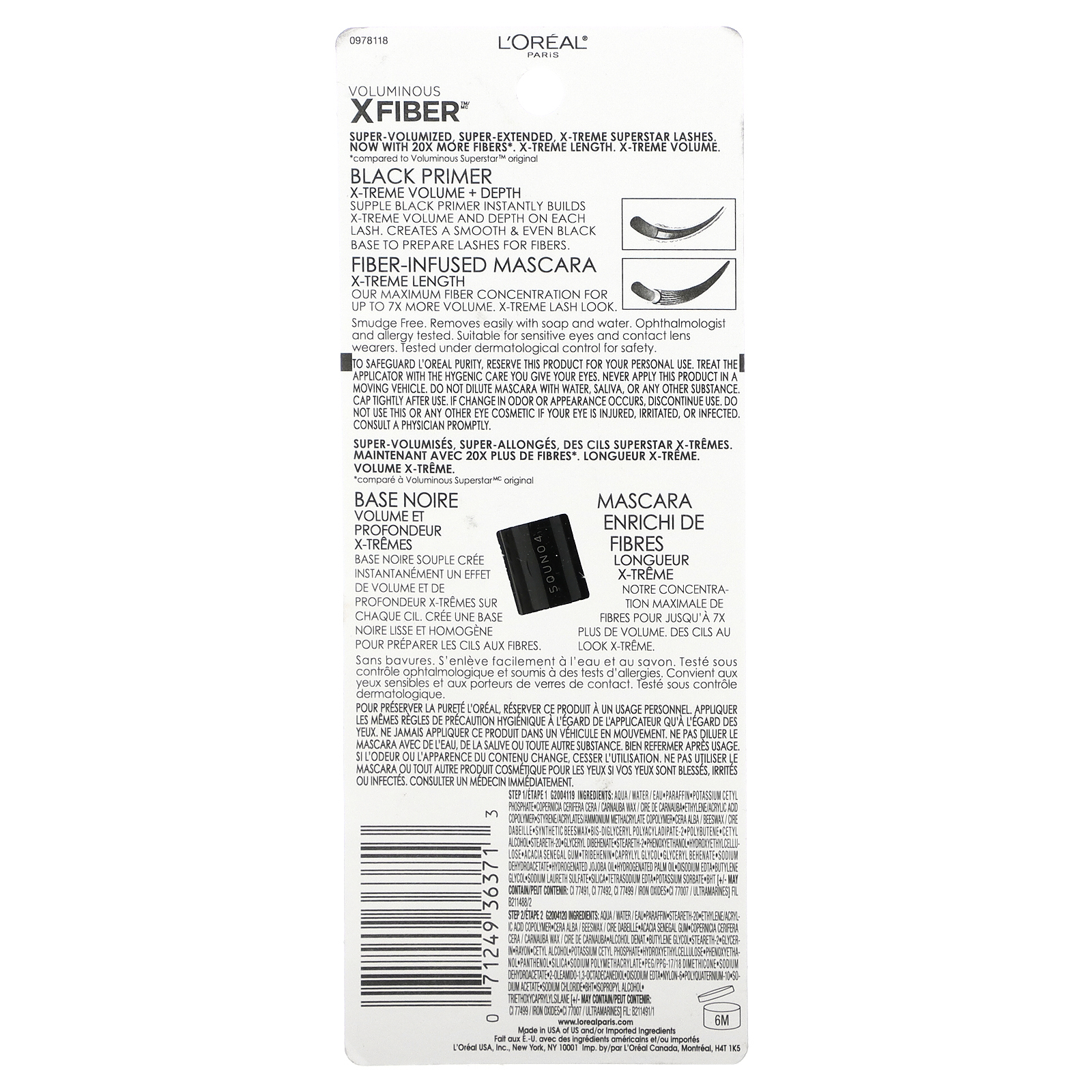 Этап 2. Вода, парафин, стеарет-20, сополимер этилена и акриловой кислоты, пчелиный воск (Cera alba), смола сенегальской акации (Acacia senegal), карнаубский воск (Copernicia cerifera), денатурированный спирт, бутиленгликоль, стеарет-2, глицерин, вискоза, цетиловый спирт, цетилфосфат калия, гидроксиэтилцеллюлоза, феноксиэтанол, пантенол, диоксид кремния, полиметакрилат натрия, ПЭГ/ППГ-17/18 диметикон, дегидроацетат натрия, 2-олеамидо-1,3-октадекандиол, двунатриевая ЭДТК, нейлон-6, поликватерниум-10, ацетат натрия, хлорид натрия, бутил-гидрокситолуол, изопропиловый спирт, триэтоксикаприлилсилан. Может содержать оксиды железа CI 77499, пигмент ультрамарин (CI 77007).