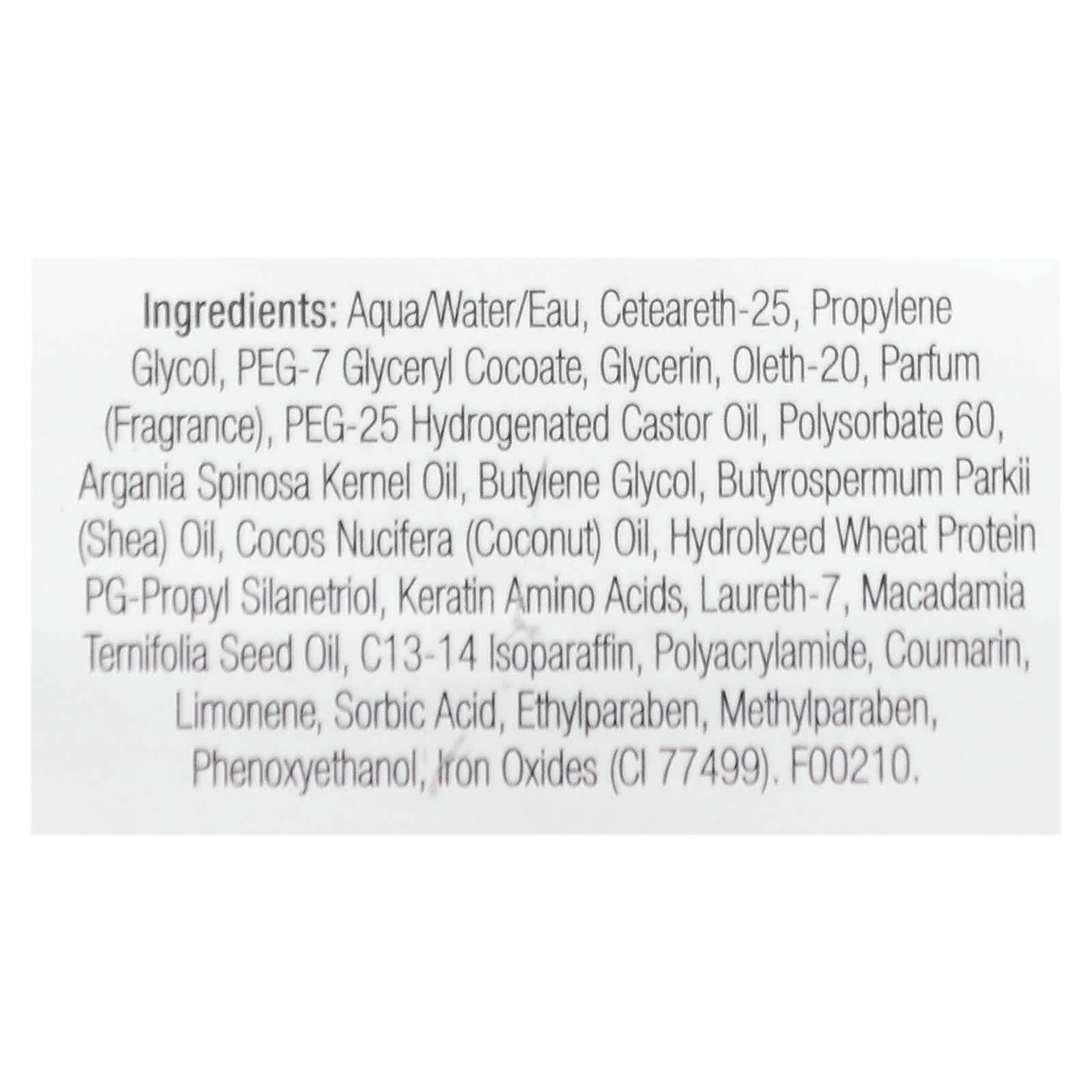 Вода (Aqua/eau), цетеарет-25, пропиленгликоль, ПЭГ-7 глицерил кокоат, глицерин, олет-20, парфюмерная композиция (отдушка), ПЭГ-25 гидрогенизированное касторовое масло, полисорбат 60, аргановое масло (Argania spinosa), бутиленгликоль, масло ши (Butyrospermum parkii), кокосовое масло (Cocos nucifera), гидролизованный белок пшеницы ПГ-пропил силантриол, аминокислоты кератина, лаурет-7, масло макадамии (Macadamia ternifolia), c13-14 изопарафин, полиакриламид, кумарин, лимонен, сорбиновая кислота, этилпарабена, метилпарабен, феноксиэтанол, оксиды железа (CI 77499).