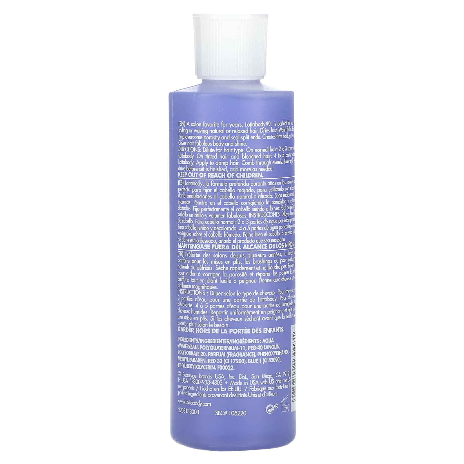 Lottabody® - фаворит в салонах красоты на протяжении многих лет. Он идеально подходит для влажной укладки, укладки феном, а также для завивки натуральных или расслабленных волос. Быстро сохнет. Не отслаивается, прилипает к волосам, помогая преодолеть пористость и запечатывая секущиеся кончики. Обеспечивает прочную фиксацию, легко расчесывается. Придает волосам пышность и блеск.