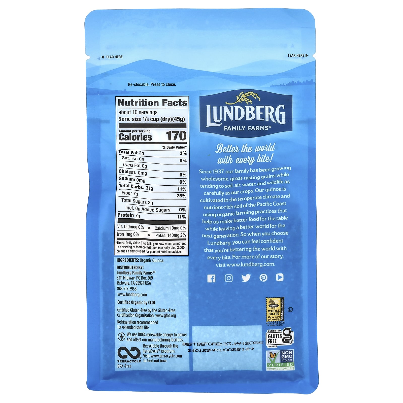 Наша семья занимается производством высококачественных органических продуктов. Мы выращиваем рис на протяжении четырех поколений, с 1937 года, и мы рады расширить наше хозяйство, включив в него органическую киноа. Наша античная белая киноа выращивается на тихоокеанском побережье США в сотрудничестве с фермерами-новаторами, которые разделяют наши традиции бережного отношения к природным ресурсам и пропаганды здоровой экосистемы.