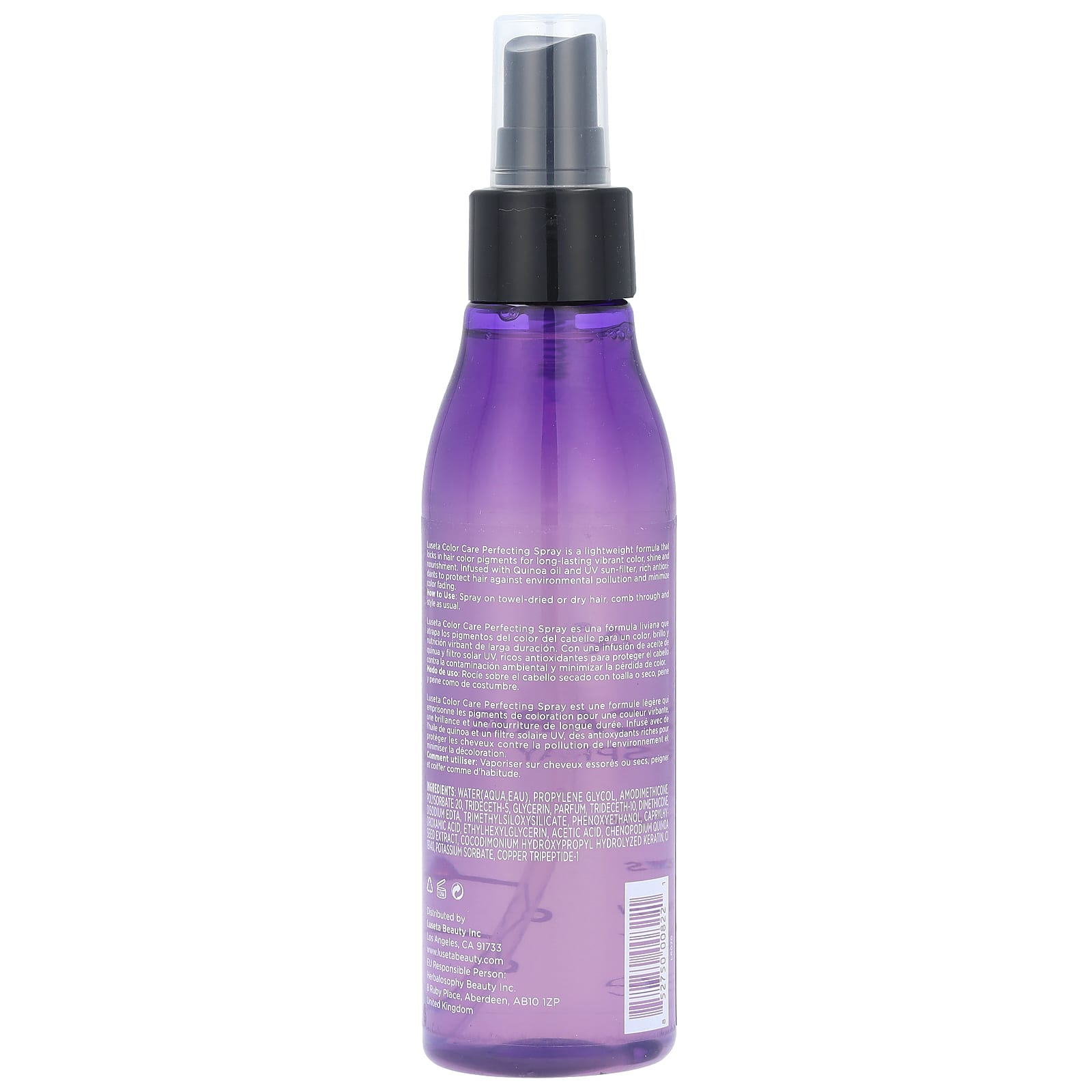 Luseta Color Care Perfecting Spray - это легкая формула, которая удерживает красящие пигменты для волос, обеспечивая стойкий яркий цвет, блеск и питание. Содержит масло киноа и солнцезащитный УФ-фильтр, богатый антиоксидантами, которые защищают волосы от загрязнения окружающей среды и минимизируют выцветание.