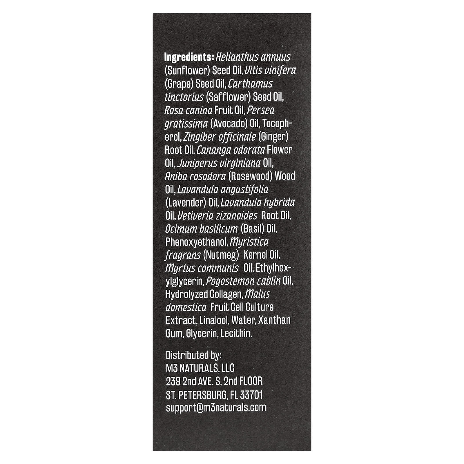 Подсолнечное масло (Helianthus annuus). Vitis vinifera (масло из виноградных косточек), масло семян сафлора (Carthamus tinctorius), масло шиповника (Rosa canina), масло авокадо (Persea gratissima), токоферол, масло корня имбиря (Zingiber officinale), масло из цветков иланг-иланга (Cananga odorata), масло можжевельника виргинского (Juniperus virginiana), древесное масло розового дерева (Aniba rosodora), лавандовое масло (Lavandula angustifolia), лавандовое масло (Lavandula hybrida), масло корня ветиверии (Vetiveria zizanoides), масло базилика (Ocimum basilicum), феноксиэтанол, масло ядер мускатного ореха (Myristica fragrans), масло мирта обыкновенного (Myrtus communis), этилгексилглицерин, масло пачули (Pogostemon cablin), гидролизованный коллаген, экстракт культуры клеток плодов яблони домашней (Malus domestica), линалоол, вода, ксантановая камедь, глицерин, лецитин.