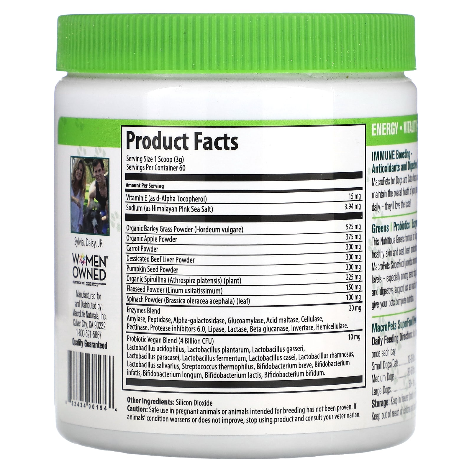 Эта питательная зелень для собак и кошек содержит ключевые витамины для здоровья кожи и шерсти, защиты сердца, свежести дыхания и улучшения пищеварения. MacroPets SuperFood обеспечивает иммунную поддержку и восстанавливает уровень энергии, особенно у пожилых собак. Ваши пушистые друзья нуждаются в антиоксидантах и поддержке пищеварения не меньше вас. MacroPets - это простой способ обеспечить ваших питомцев полноценным питанием.