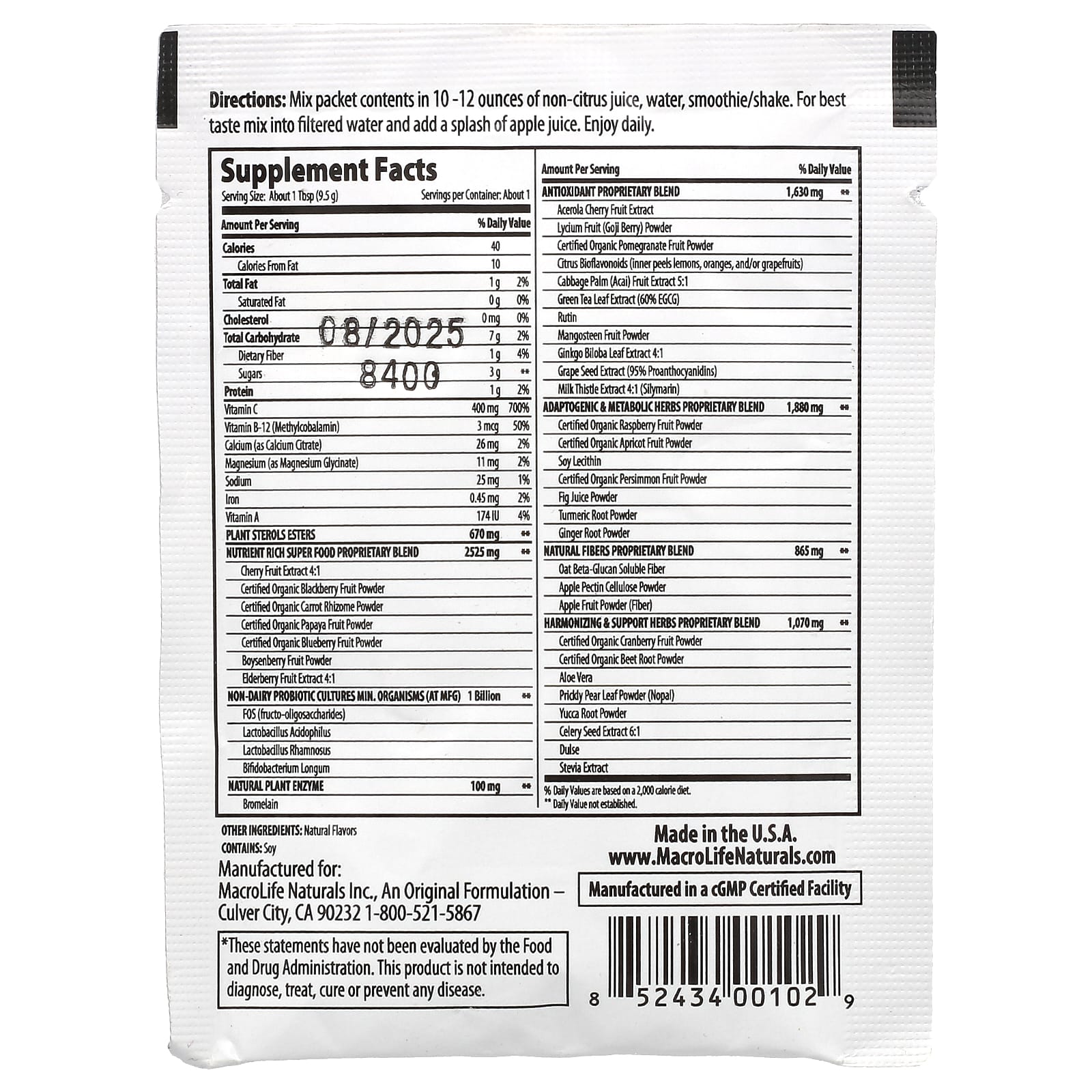 | Запатентованная смесь питательных суперфудов | 2525 мг | ** |