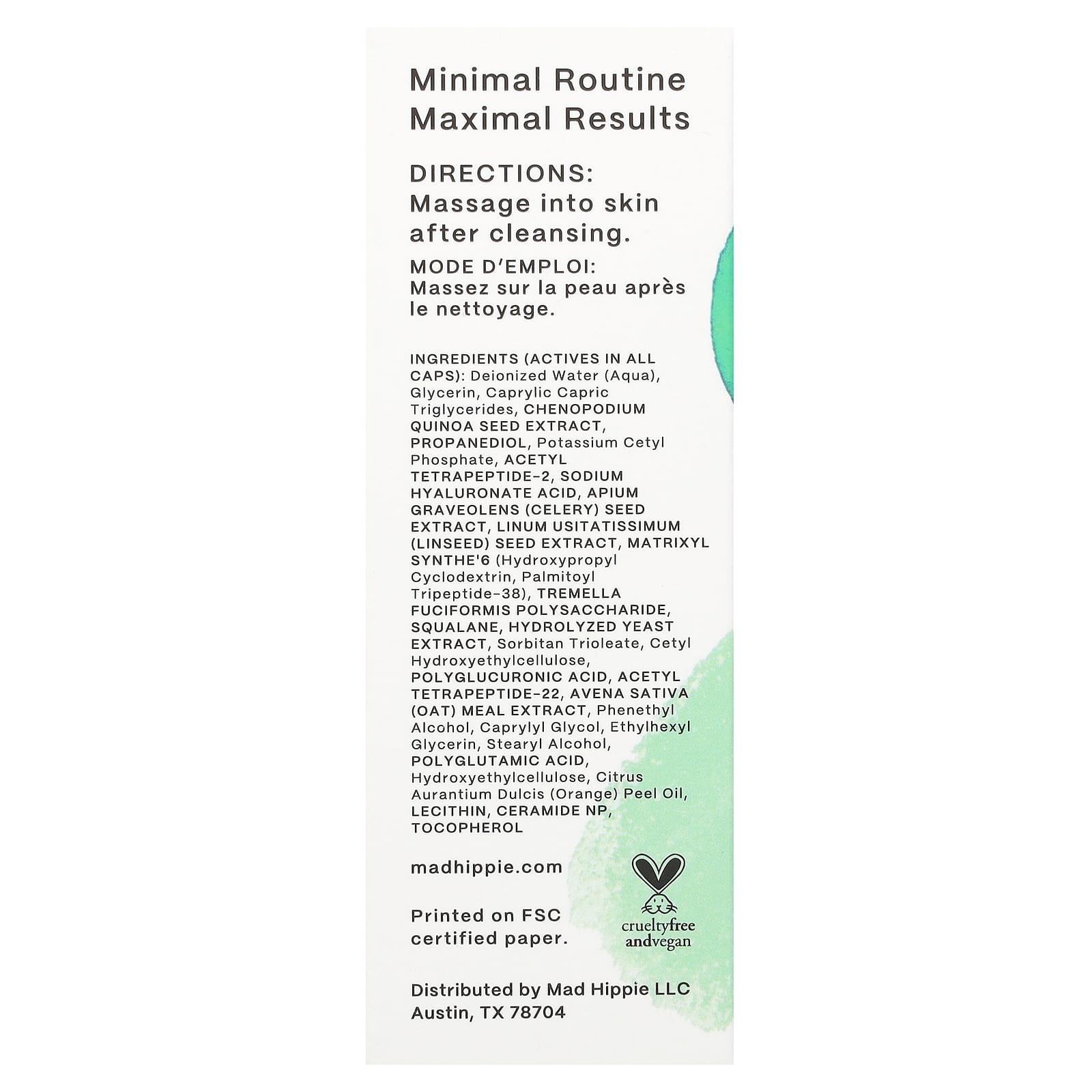 деионизированная вода, глицерин, каприловые/каприновые триглицериды, экстракт киноа (Chenopodium quinoa)*, пропандиол*, цетил фосфат калия, ацетил тетрапептид-2*, гиалуронат натрия*, экстракт семян сельдерея (Apium graveolens)*, экстракт семян льна (Linum usitatissimum)*, * матрица synthe'6 (гидроксипропил циклодекстрин, пальмитоил трипептид-38), полисахарид тремелла фукусовидная (Tremella fuciformis)*, сквалан*, * гидролизованный экстракт дрожжей, сорбитан триолеат, цетил гидроксиэтилцеллюлоза, полиглюкуроновая кислота*, ацетил тетрапептид-22*, экстракт овсяной муки (Avena sativa)*, фенетиловый спирт, каприлилгликоль, этилгексилглицерин, стеариловый спирт, полиглутаминовая кислота*, гидроксиэтилцеллюлоза, масло из цедры апельсина (Citrus aurantium dulcis), лецитин*, керамид NP*, * токоферол.