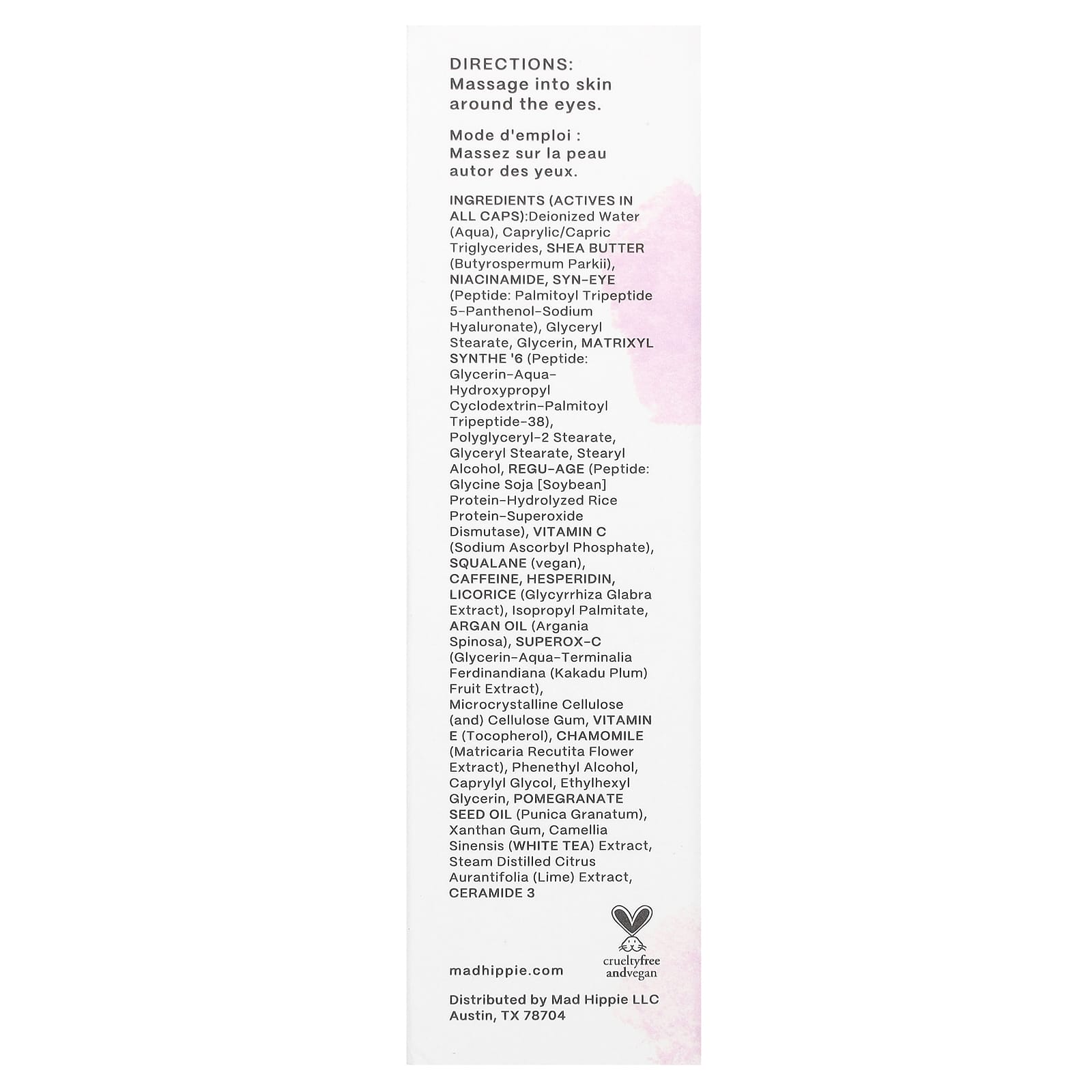 Деионизированная вода (aqua), каприловые/каприновые триглицериды, масло ши (Butyrospermum parkii), никотинамид, syn-eye (пептид: пальмитоилтрипептид 5-пантенол, гиалуронат натрия), глицерил стеарат, глицерин, matrixyl synthe'6 (пептидный комплекс: глицерин-вода-гидроксипропил циклодекстрин-пальмитоил трипептид-38), полиглицерил-2 стеарат, глицерил стеарат, стеариловый спирт, regu-age (пептид: глицин из сои, протеин, гидролизованный рисовый протеин, супероксиддисмутаза), витамин C (аскорбил фосфат натрия), сквалан (веганский), кофеин, гесперидин, экстракт корня солодки (Glycyrrhiza glabra), изопропилпальмитат, аргановое масло (Argania spinosa), Superox-C (экстракт плодов сливы какаду (Glycerin-aqua-terminalia ferdinandiana)), микрокристаллическая целлюлоза и целлюлозная камедь, витамин E (токоферол), экстракт цветков ромашки (Matricaria recutita), фенетиловый спирт, каприлилгликоль, этилгексилглицерин, масло гранатовых косточек (Punica granatum), ксантановая камедь, экстракт белого чая (Camellia sinensis), экстракт паровой дистилляции лайма (Citrus aurantifolia), керамид 3.