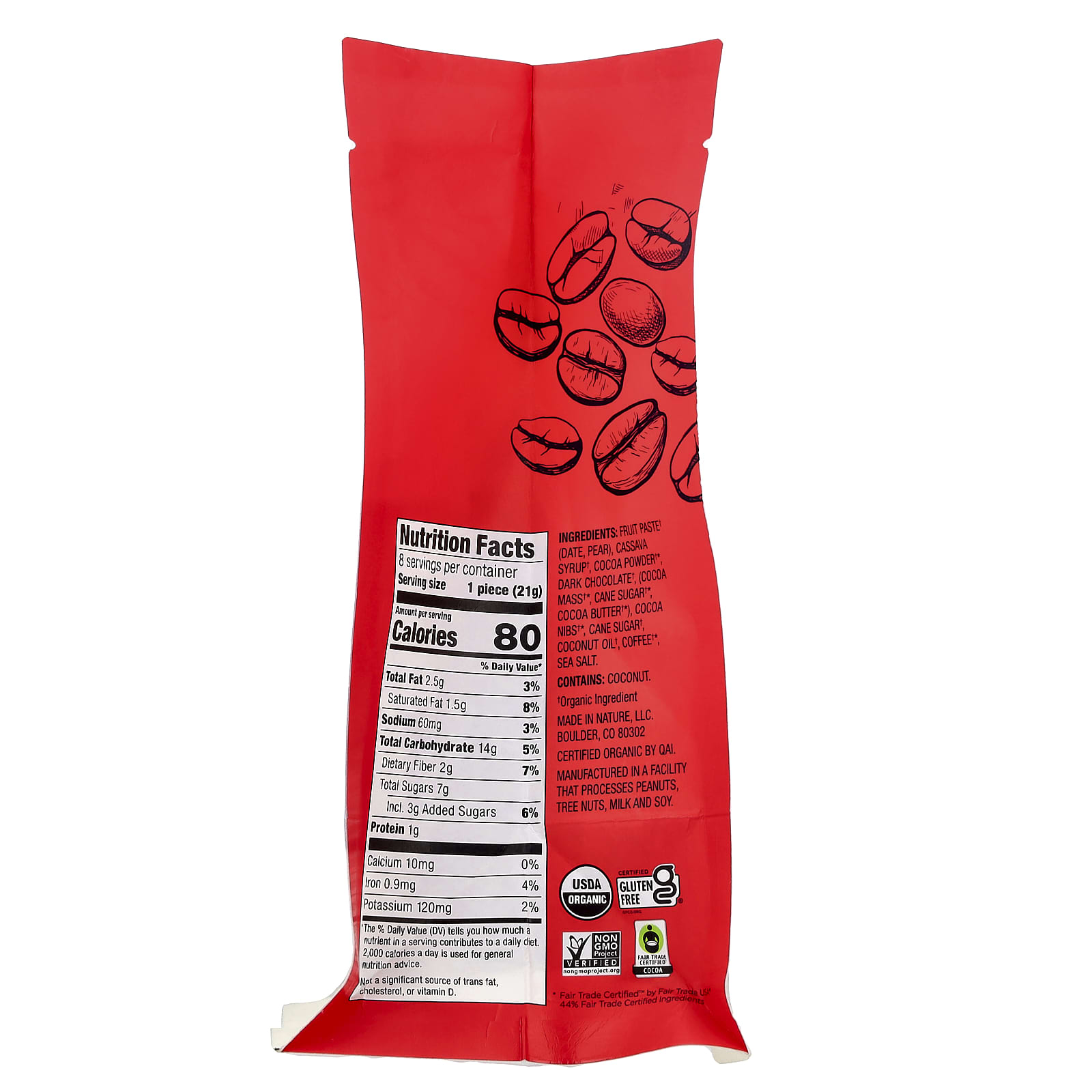 Содержит органический шоколад, кофе, финики, груши, темный шоколад, кокосовое масло и тростниковый сахар.