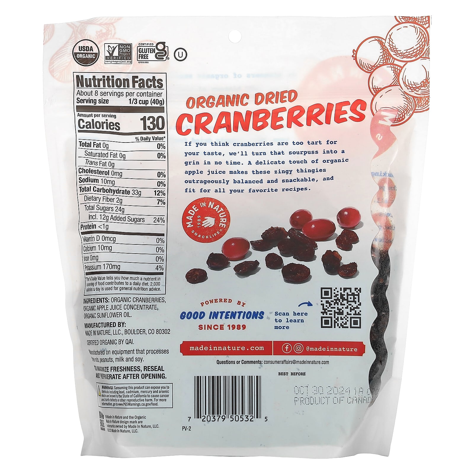 На самом деле, если вы считаете, что клюква слишком терпкая на ваш вкус, мы мгновенно превратим эту кислинку в ухмылку. Благодаря нежному привкусу органического яблочного сока эти аппетитные штучки идеально подходят для приготовления любых блюд. Ах, спасибо природе. Вы всегда можете быть уверены в том, что Made In Nature убережет от грязи.