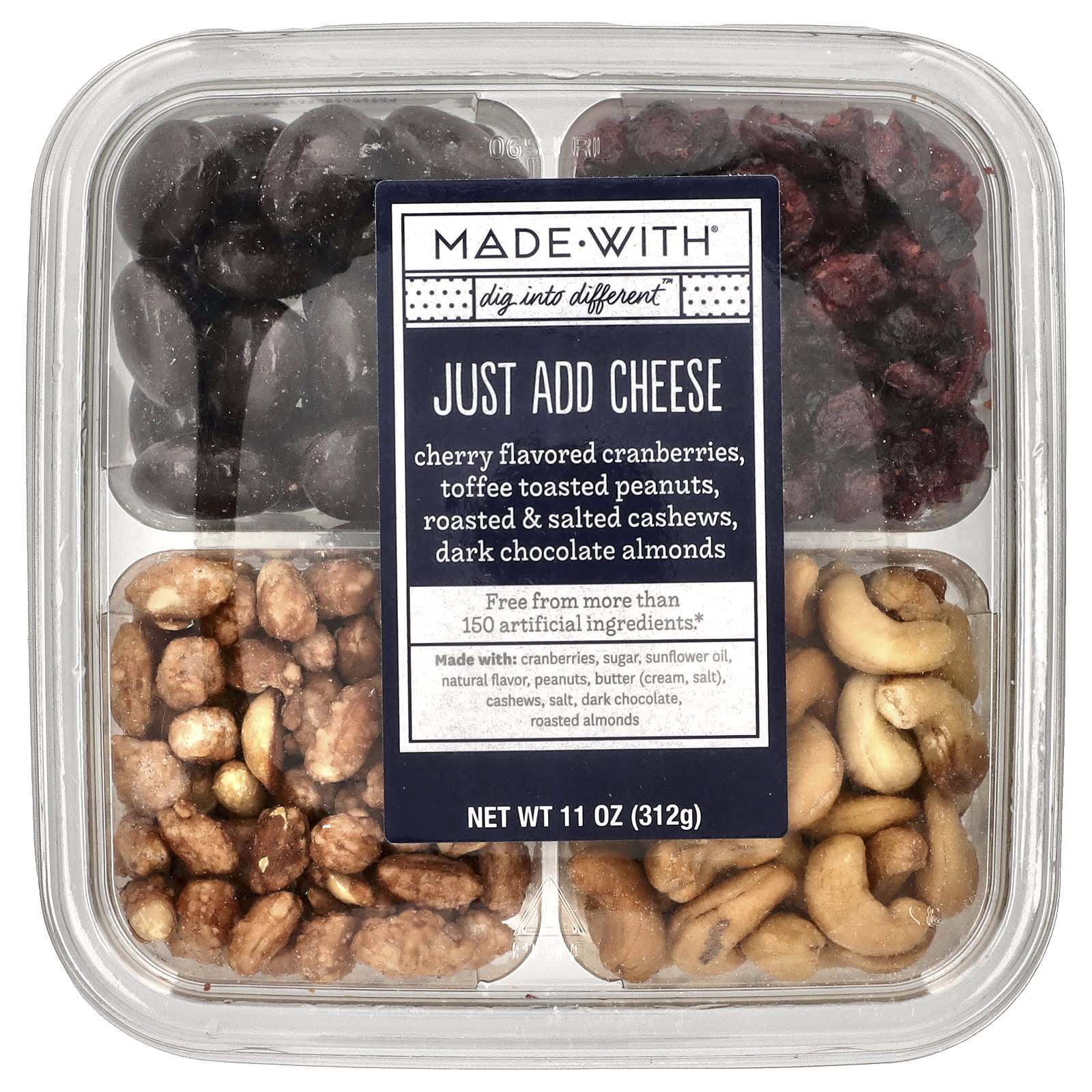 Содержит Клюква, сахара, подсолнечное масло, натуральный ароматизатор, арахиса, масло (сливки, соль), кешью, соль, темный шоколад, жареный миндаль.