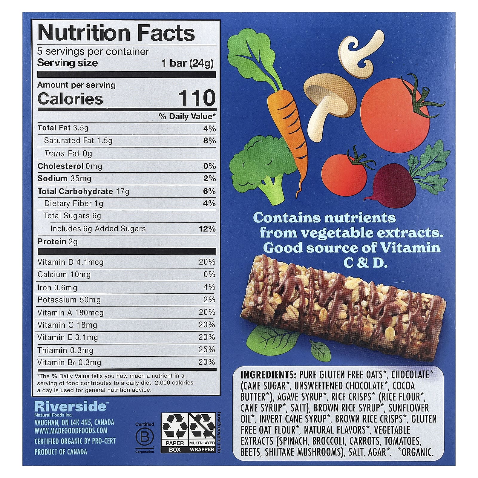 Чистый овес без глютена *, шоколад (тростниковый сахар *, несладкий шоколад *, какао-масло*), сироп агавы *, рисовые чипсы * (тростниковый сироп из рисовой муки *, соль), сироп из коричневого риса *, подсолнечное масло *, тростниковый сироп *, чипсы из коричневого риса *, безглютеновая овсяная мука *, натуральные ароматизаторы *, растительные экстракты (шпинат, брокколи, морковь, томаты, свекла, грибы шиитаке), соль, агар *.