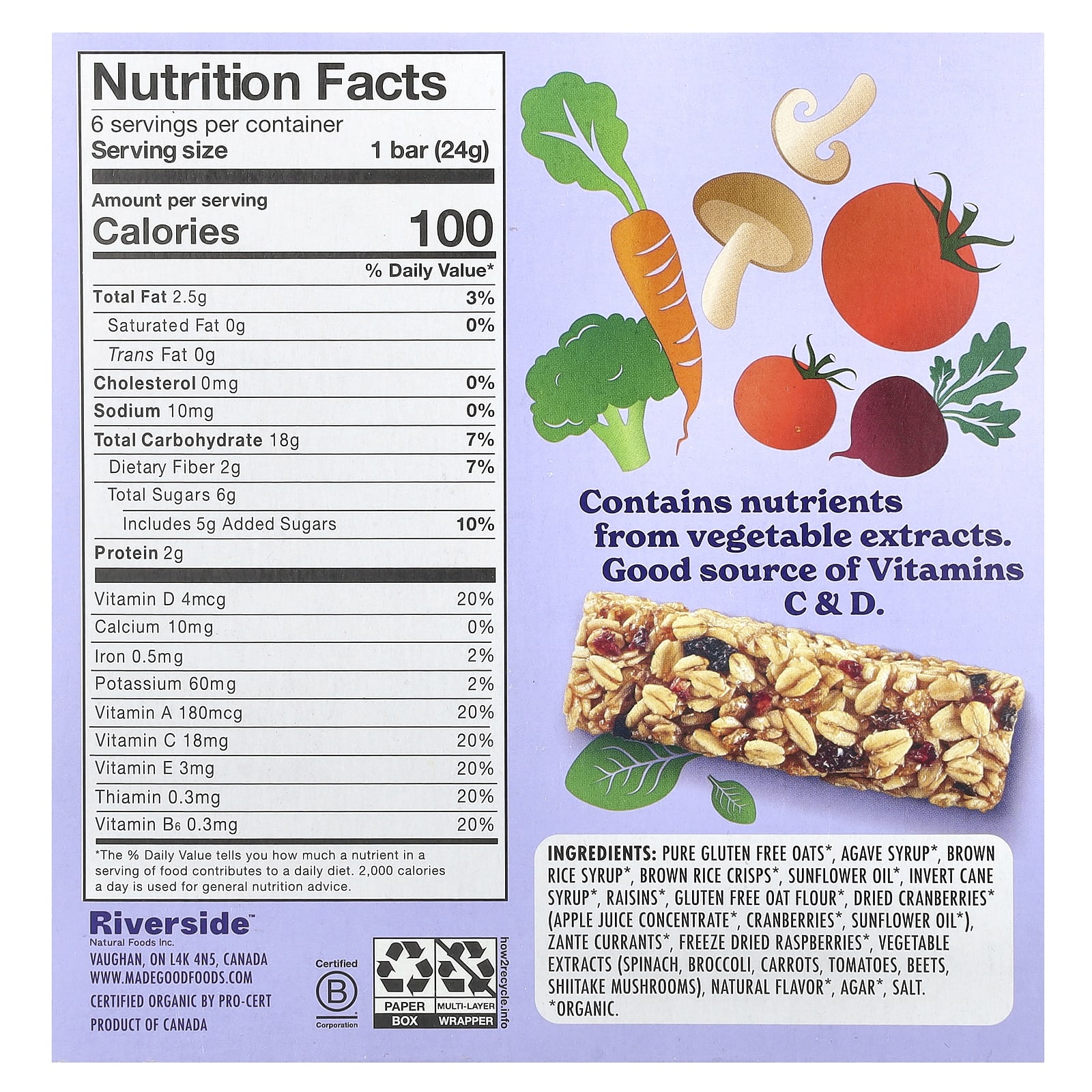 Чистый овес без глютена *, сироп агавы *, сироп из коричневого риса *, чипсы из коричневого риса *, подсолнечное масло*, инвертный тростниковый сироп*, изюм *, безглютеновая овсяная мука *, сушеная клюква * (концентрат яблочного сока *, клюква *, подсолнечное масло *), смородина (смородина) *, сублимированная малина *, растительные экстракты (шпинат, брокколи, морковь, Томаты, свекла, грибы шиитаке), натуральный ароматизатор*, агар *, соль.