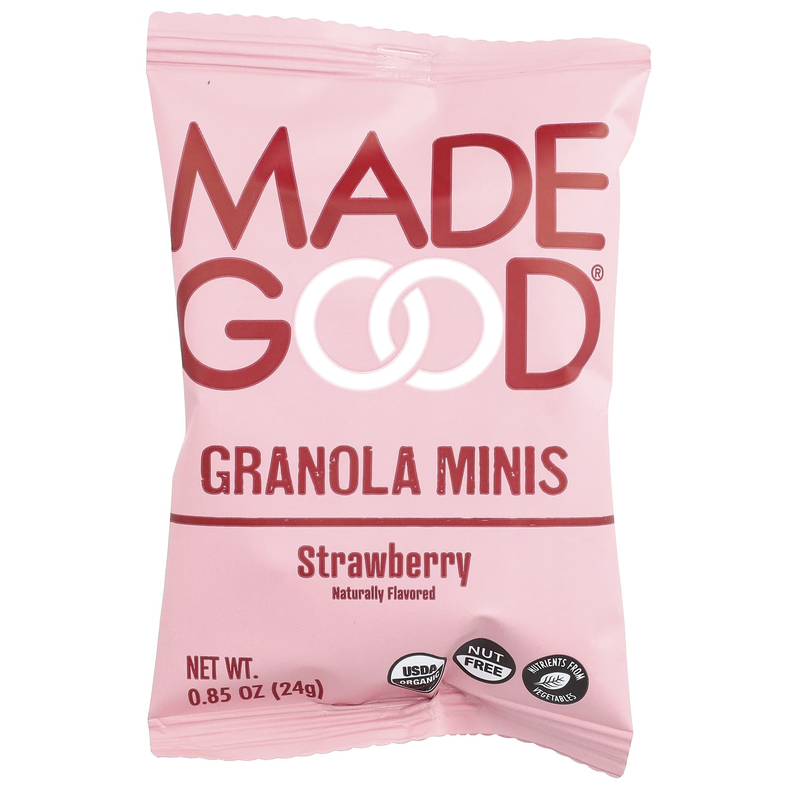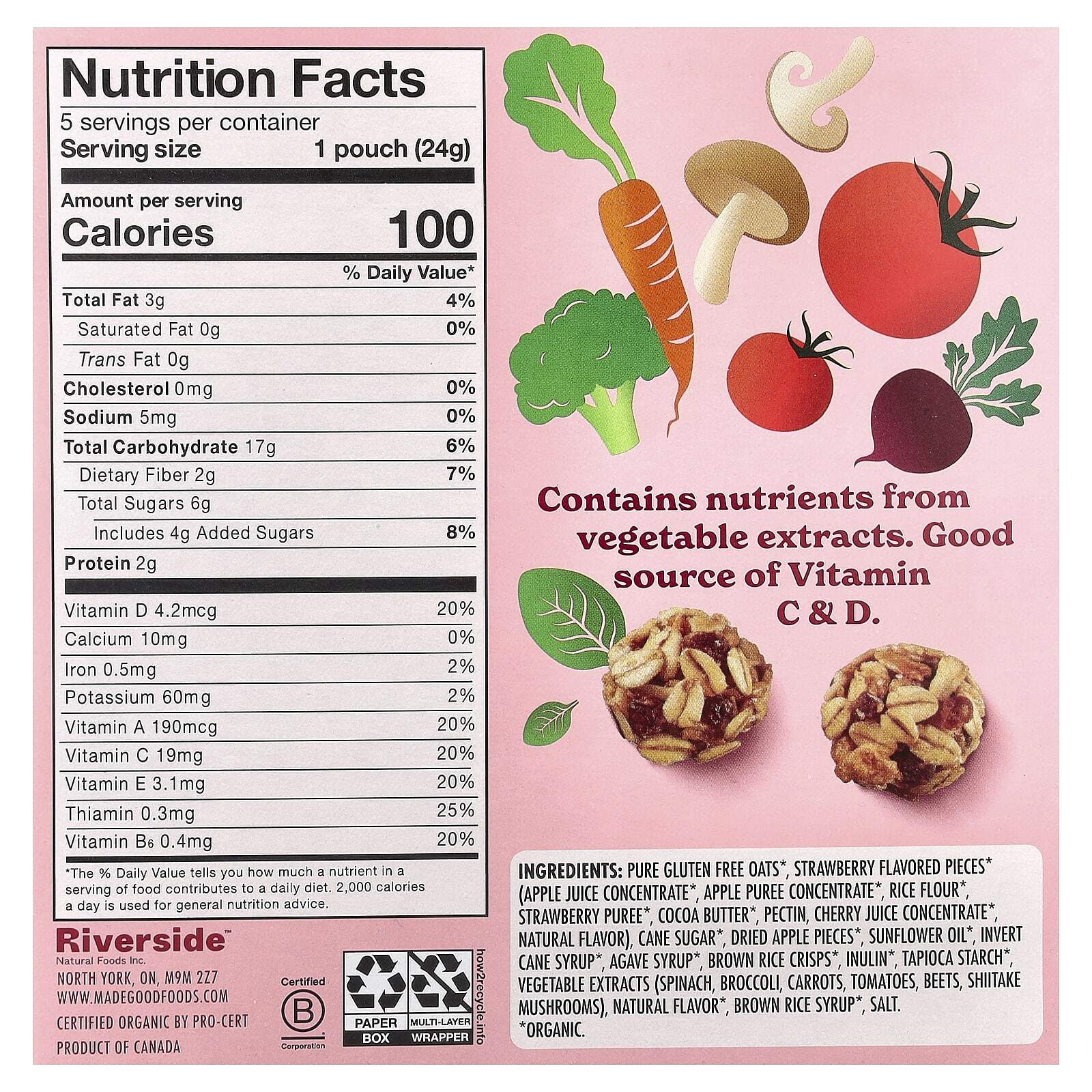 Чистый овес без глютена *, кусочки со вкусом клубники * (концентрат яблочного сока *, концентрат яблочного пюре *, рисовая мука *, клубничное пюре *, какао-масло *, пектин, концентрат вишневого сока * натуральный ароматизатор), тростниковый сахар *, кусочки сушеного яблока *, подсолнечное масло *, тростниковый сироп *, сироп агавы *, чипсы из коричневого риса *, инулин *, тапиоковый крахмал *, растительные экстракты (шпинат, брокколи, морковь, томат, свекла, грибы шиитаке), натуральный ароматизатор *, сироп из коричневого риса *, соль.