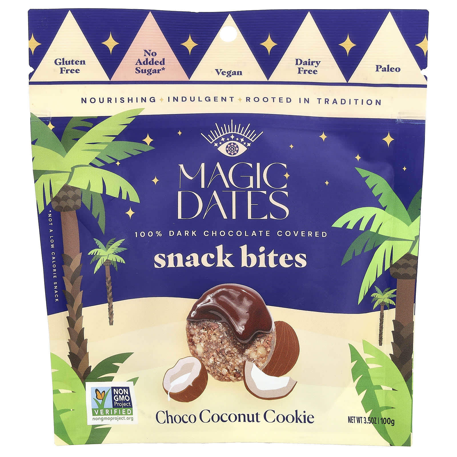 Даты *, горький шоколад, грецкие орехи, тертый кокос, кокосовый крем, ядра какао-бобов *, кокосовый порошок *, экстракт кокоса, розовая гималайская соль.