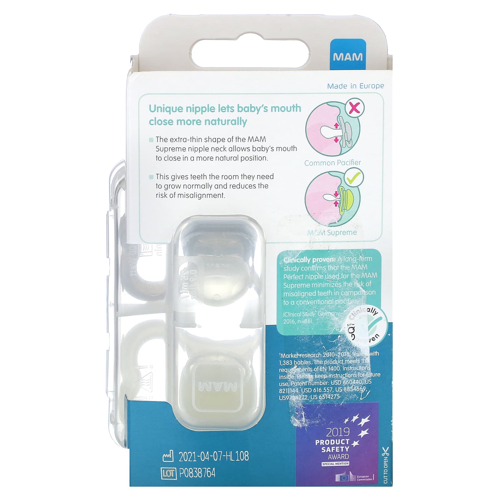 Клинически подтверждено: Долгосрочное исследование подтверждает, что соска MAM Perfect, используемая в MAM Supreme, сводит к минимуму риск перекоса зубов по сравнению с обычной соской. (Клиническое исследование: Германия, 2016 г., n = 86).