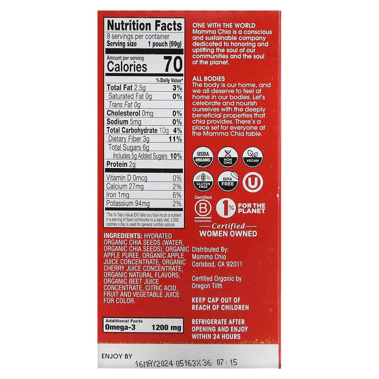 Гидратированные органические семена чиа (вода, органические семена чиа), органическое яблочное пюре, концентрат органического яблочного сока, концентрат органического вишневого сока, органические натуральные ароматизаторы, концентрат органического свекольного сока, лимонная кислота, фруктовый и овощной сок (красители).