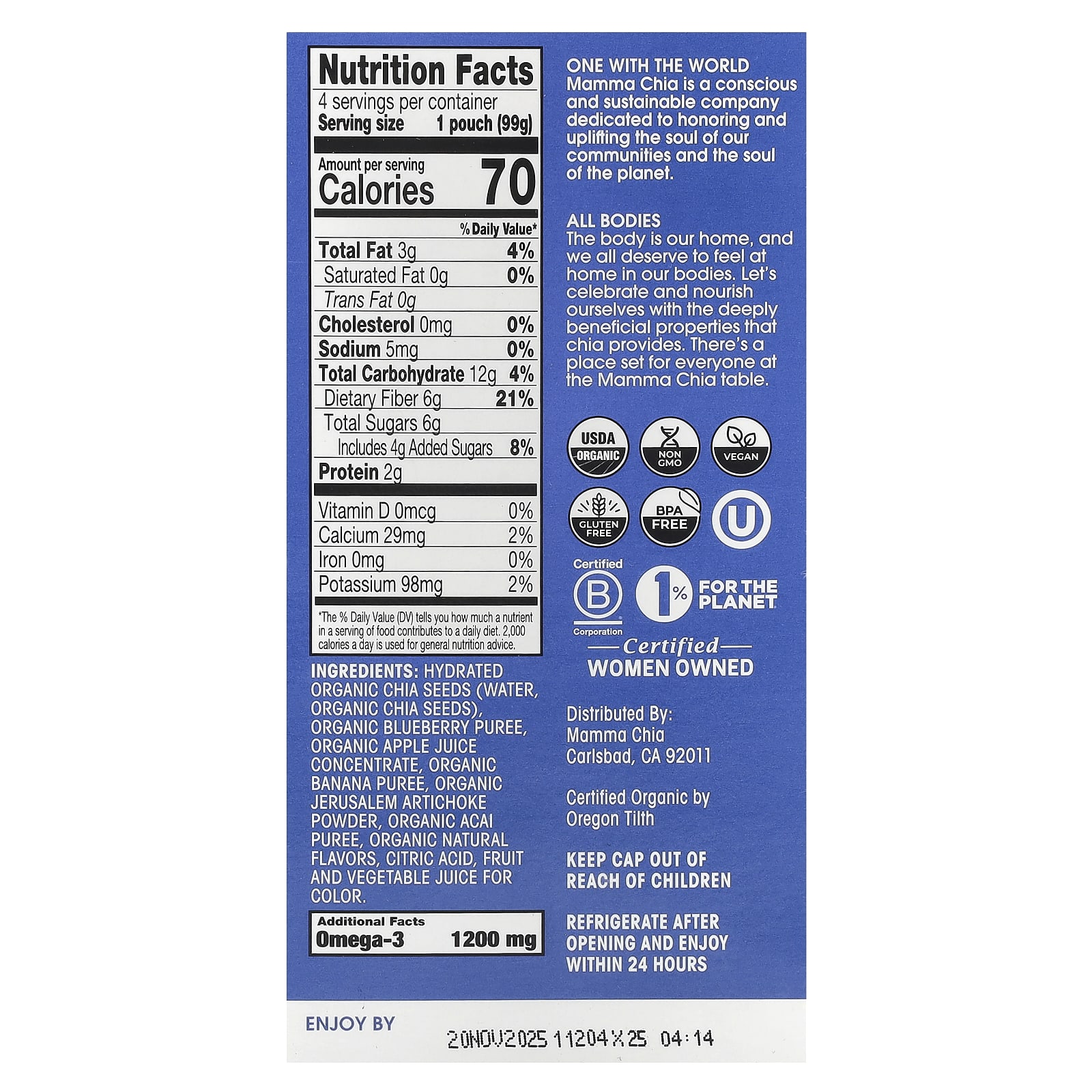 Гидратированные органические семена чиа (вода, органические семена чиа), органическое черничное пюре, концентрат органического яблочного сока, органическое банановое пюре, порошок из органического топинамбура, органическое пюре из асаи, органические натуральные ароматизаторы, лимонная кислота, фруктово-овощной сок для цвета.