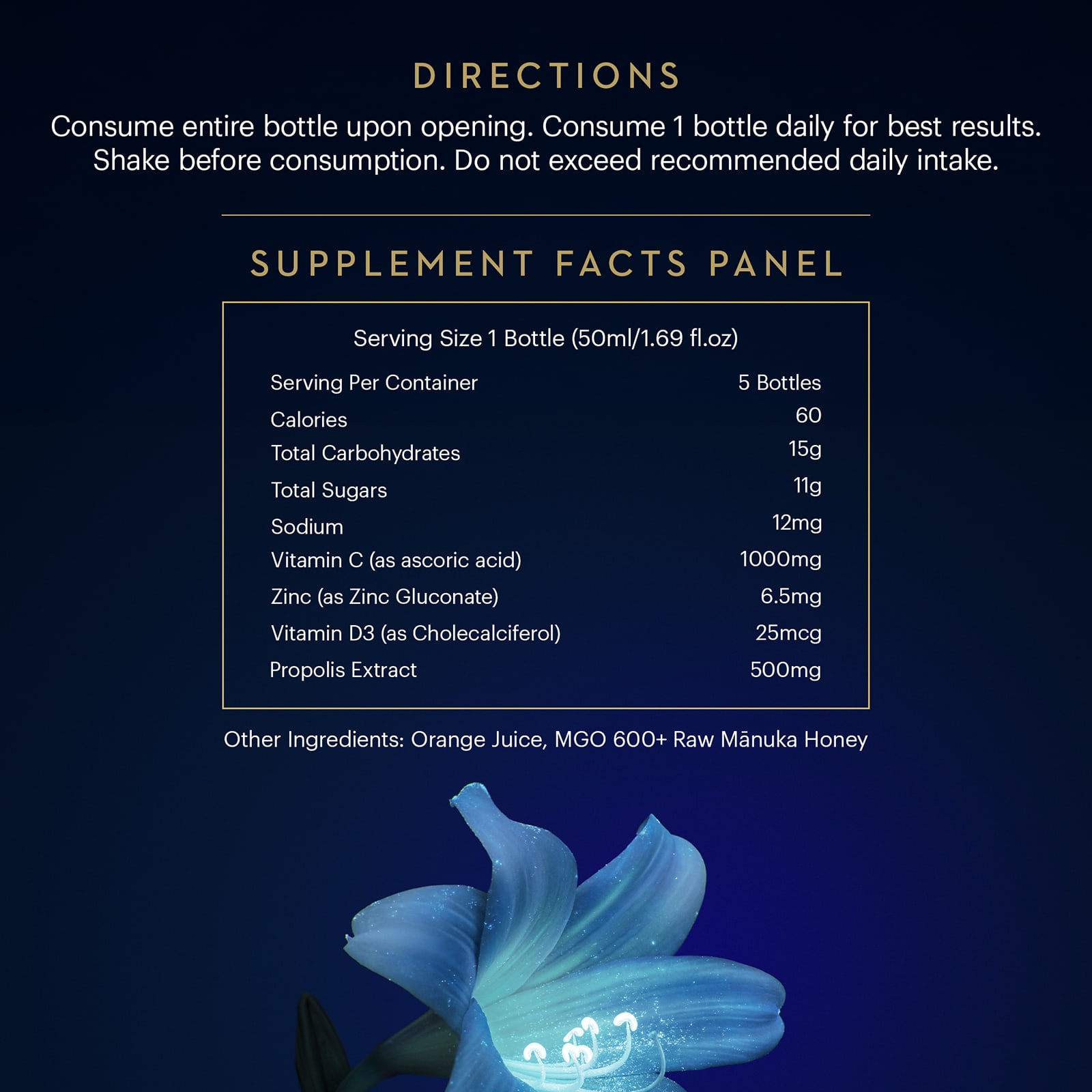 Прополис — это один из даров природы, полученный прямиком из пчелиного улья. Его биоактивные свойства защищают и питают потрясающую экосистему. Этот мощный эликсир, предназначенный для приема один раз в день, использует природные полезные свойства необработанного меда манука MGO 600+, витамин С, прополис, цинк витамин D3 для поддержки здоровой иммунной функции.
