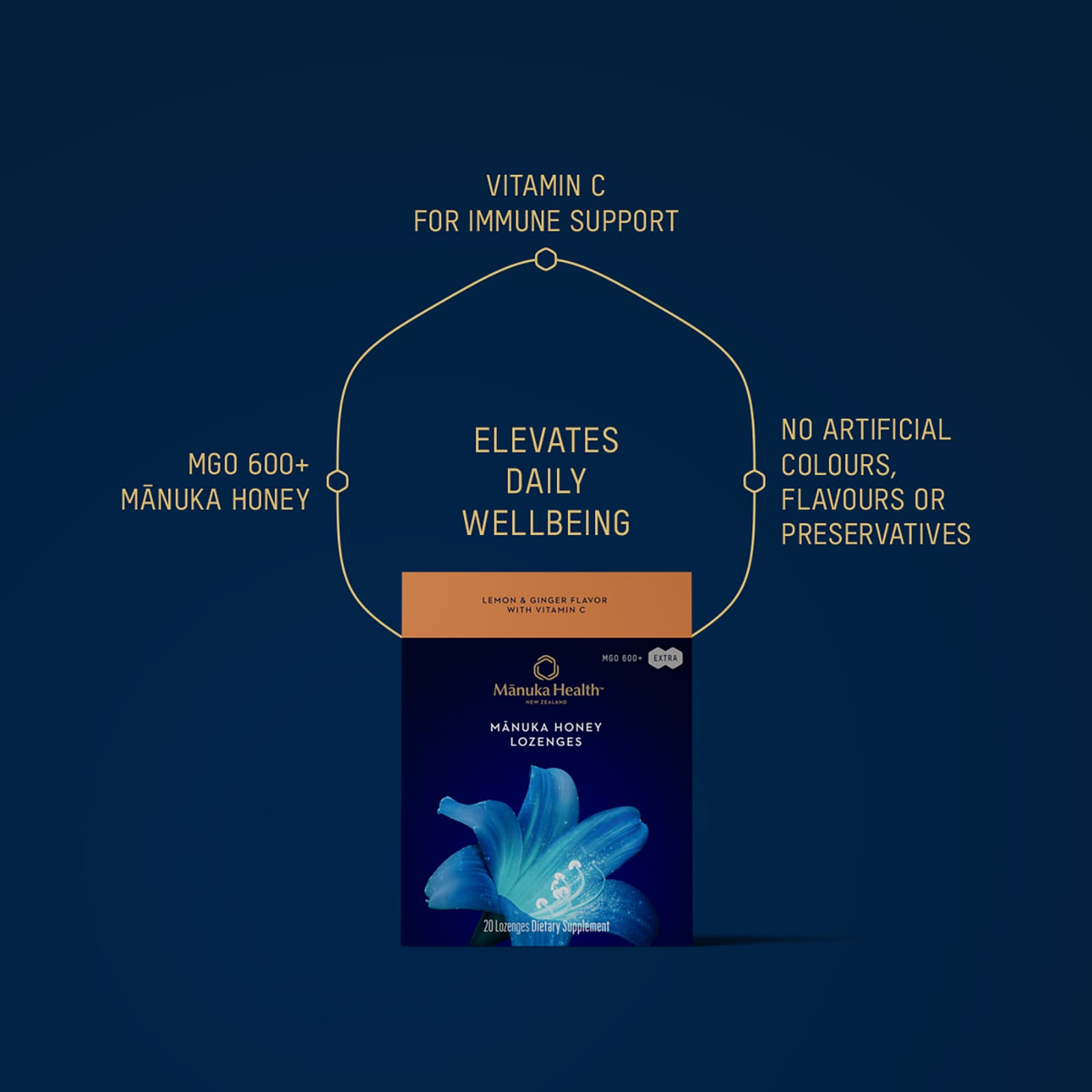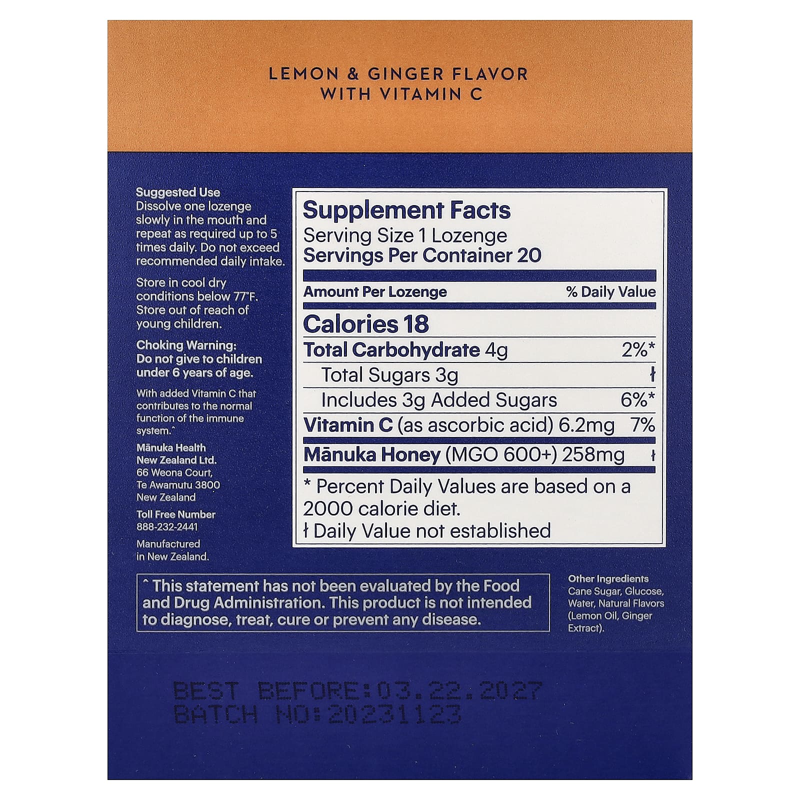 100% натуральные леденцы, изготовленные из экологически чистого меда манука из Новой Зеландии, с лимоном и имбирем. С добавлением витамина С, который способствует нормальной работе иммунной системы.