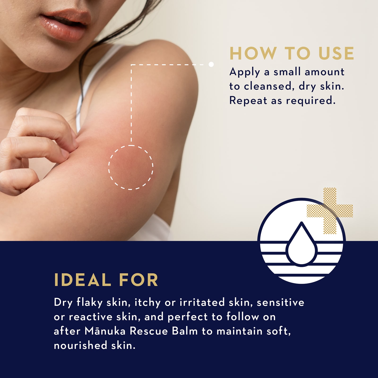 Нанесите небольшое количество на очищенную сухую кожу. При необходимости повторите. Подходит для всех возрастов и типов кожи, особенно для чувствительной и очень сухой.
