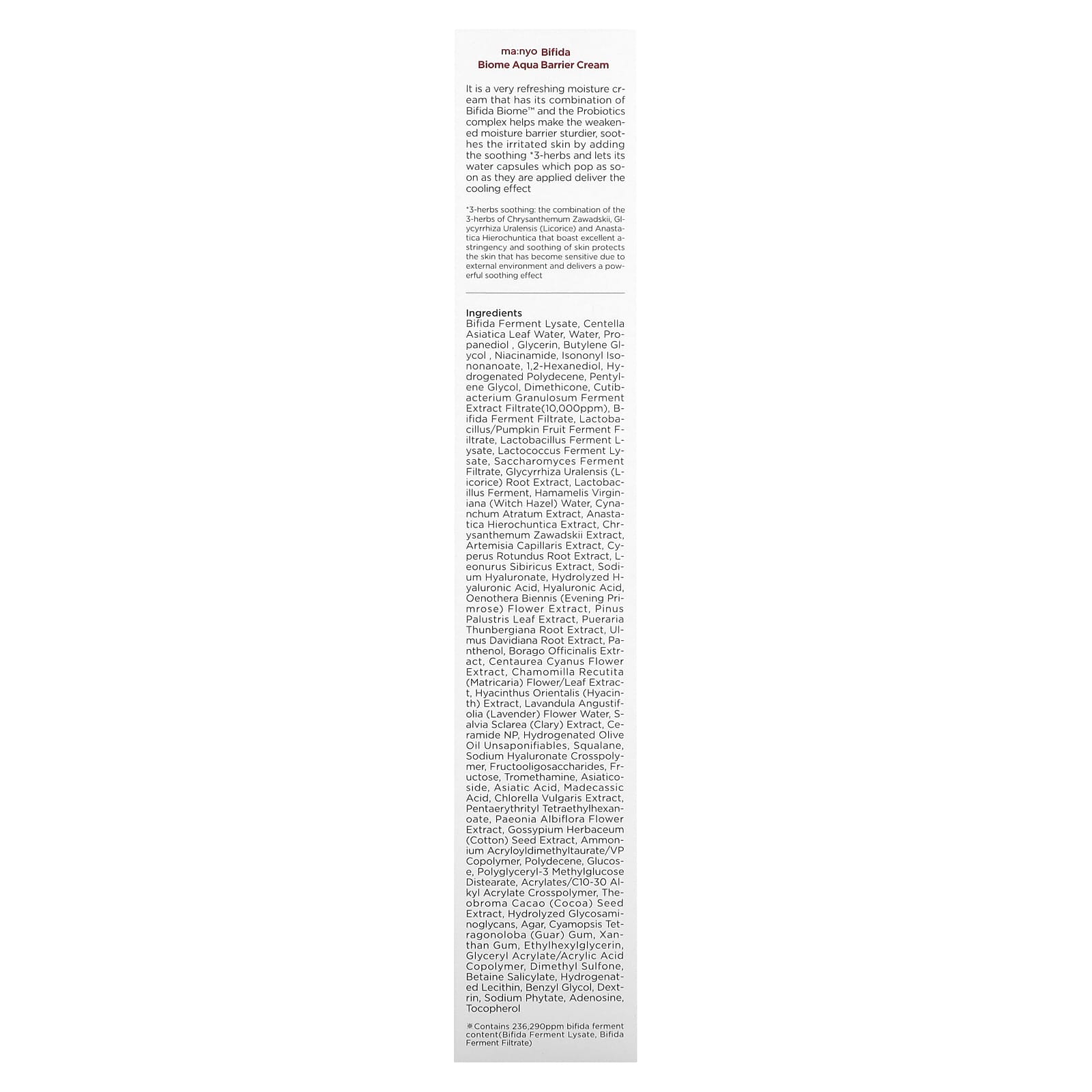 Лизат фермента бифидобактерий, вода из листьев готу колы (Centella asiatica), вода, пропандиол , глицерин, бутиленгликоль , никотинамид, изононил изононаноат, 1,2-гександиол, гидрогенизированный полидецен, пентилен гликоль, диметикон, фильтрат ферментированного экстракта Cutibacterium granulosum (10 000 част. / млн), продукт ферментации бифидобактерий, фильтрат фермента лактобактерий / плодов тыквы, лизат фермента молочнокислых бактерий (Lactobacillus), лизат ферментов лактококка, продукт ферментации дрожжевых грибков-сахаромицетов., экстракт корня солодки (Glycyrrhiza uralensis), фермент лактобактерий (Lactobacillus), вода из гамамелиса (Hamamelis virginiana), экстракт цинанхума (Cynanchum atratum), экстракт иерихонской розы (Anastatica hierochuntica), экстракт хризантемы Завадского (Chrysanthemum zawadskii), экстракт полыни (Artemisia capillaris), экстракт мкорня сыти круглой (Cyperus rotundus), экстракт леонуруса сибирского, гиалуронат натрия, гидролизованная гиалуроновая кислота, гиалуроновая кислота, экстракт цветков примулы вечерней (Oenothera biennis), экстракт хвои сосны болотной (Pinus palustris), экстракт корня пуэрарии дольчатой (Pueraria thunbergiana), экстракт корня вяза Давида (Ulmus davidiana), пантенол, экстракт бурачника (Borago officinalis), экстракт васильков (Centaurea cyanus), экстракт цветков/листьев ромашки (Chamomilla recutita), экстракт гиацинта (Hyacinthus orientalis), вода из цветков лаванды (Lavandula angustifolia), экстракт мускатного шалфея (Salvia sclarea), керамид NP, неомыляемые вещества гидрогенизированного оливкового масла, сквалан, гиалуронат натрия кроссполимер, фруктоолигосахариды, фруктоза, трометамин, азиатикозид, азиатиковая кислота, мадекассовая кислота, экстракт хлореллы (Chlorella vulgaris), пентаэритритил тетраэтилгексаноат, экстракт цветков пиона молочноцветкового (Paeonia albiflora), экстракт семян хлопчатника (Gossypium herbaceum), аммоний акрилоилдиметилтаурат/ВП сополимер, полидецен, глюкоза, полиглицерил-3 метилглюкозы дистеарат, акрилат/c10-30 алкил акрилат кроссполимер, экстракт зерен какао (Theobroma cacao), гидролизованные гликозаминогликаны, агар, гуаровая камедь (Cyamopsis tetragonoloba), ксантановая камедь, этилгексилглицерин, сополимер глицерил акрилата/акриловой кислоты, диметилсульфон, бетаин салицилат, гидрогенизированный лецитин, бензилгликоль, декстрин, фитат натрия, аденозин, токоферол.