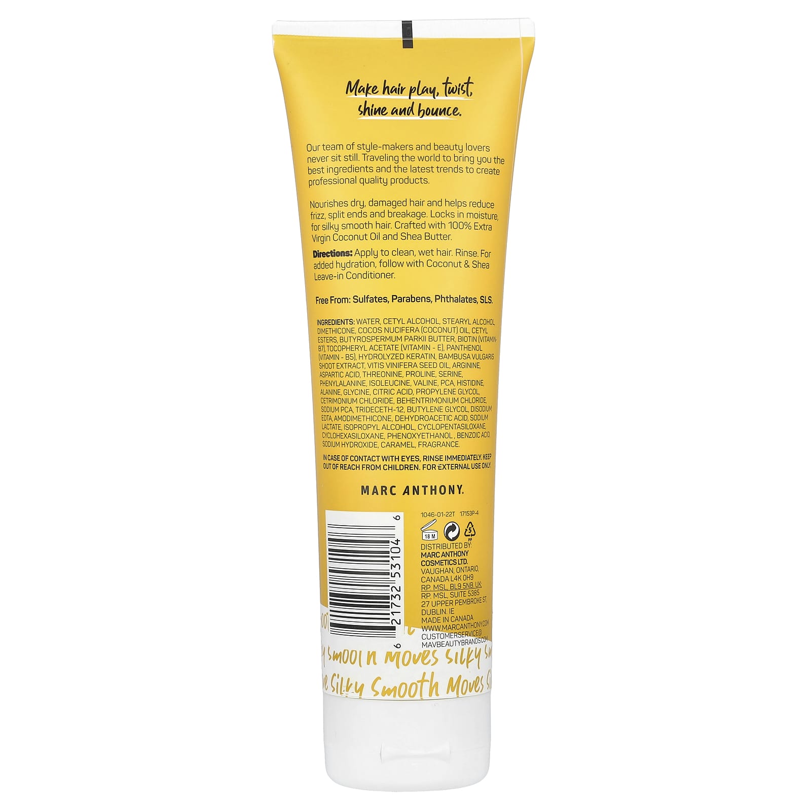 Вода, цетиловый спирт, стеариловый спирт диметикон, кокосовое масло (Cocos nucifera), цетиловые эфиры, масло Butyrospermum parkii, биотин (витамин B7), токоферилацетат (витамин E), пантенол (витамин B5), гидролизованный кератин, экстракт побегов бамбука (Bambusa vulgaris), масло из семян винограда (vitis vinifera), аргинин, аспарагиновая кислота, треонин, пролин, серин, фенилаланин, изолейцин, валин, PCA, гистидин, аланин, глицин, лимонная кислота, пропиленгликоль, цетримония хлорид, бегентримония хлорид, натрия пирролидонкарбонат, тридецет-12, бутиленгликоль, двунатриевая ЭДТК, амодиметикон, дегидроуксусная кислота, лактат натрия, изопропиловый спирт, циклопентасилоксан, циклогексасилоксан, феноксиэтанол, бензойная кислота, гидроксид натрия, карамель, отдушка.