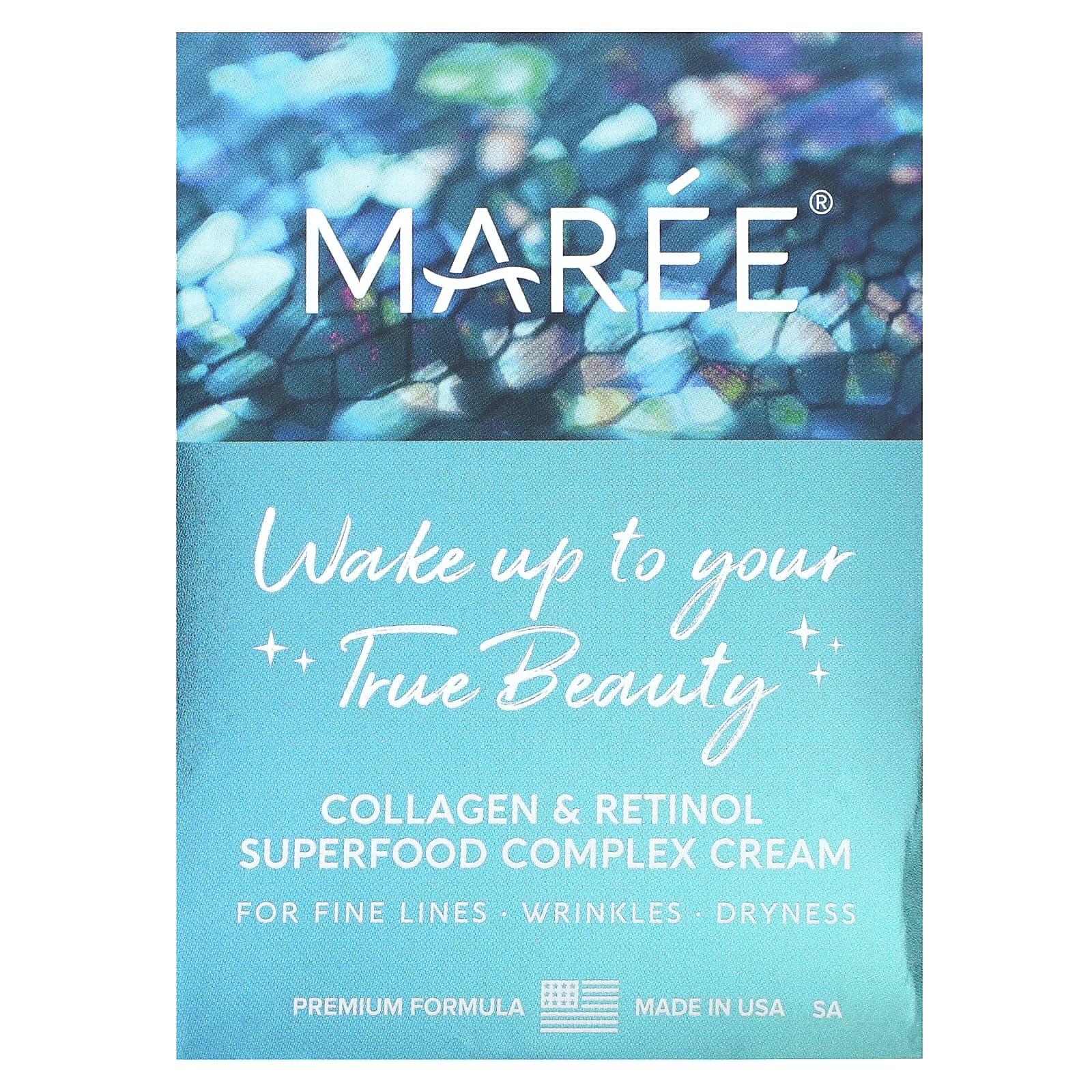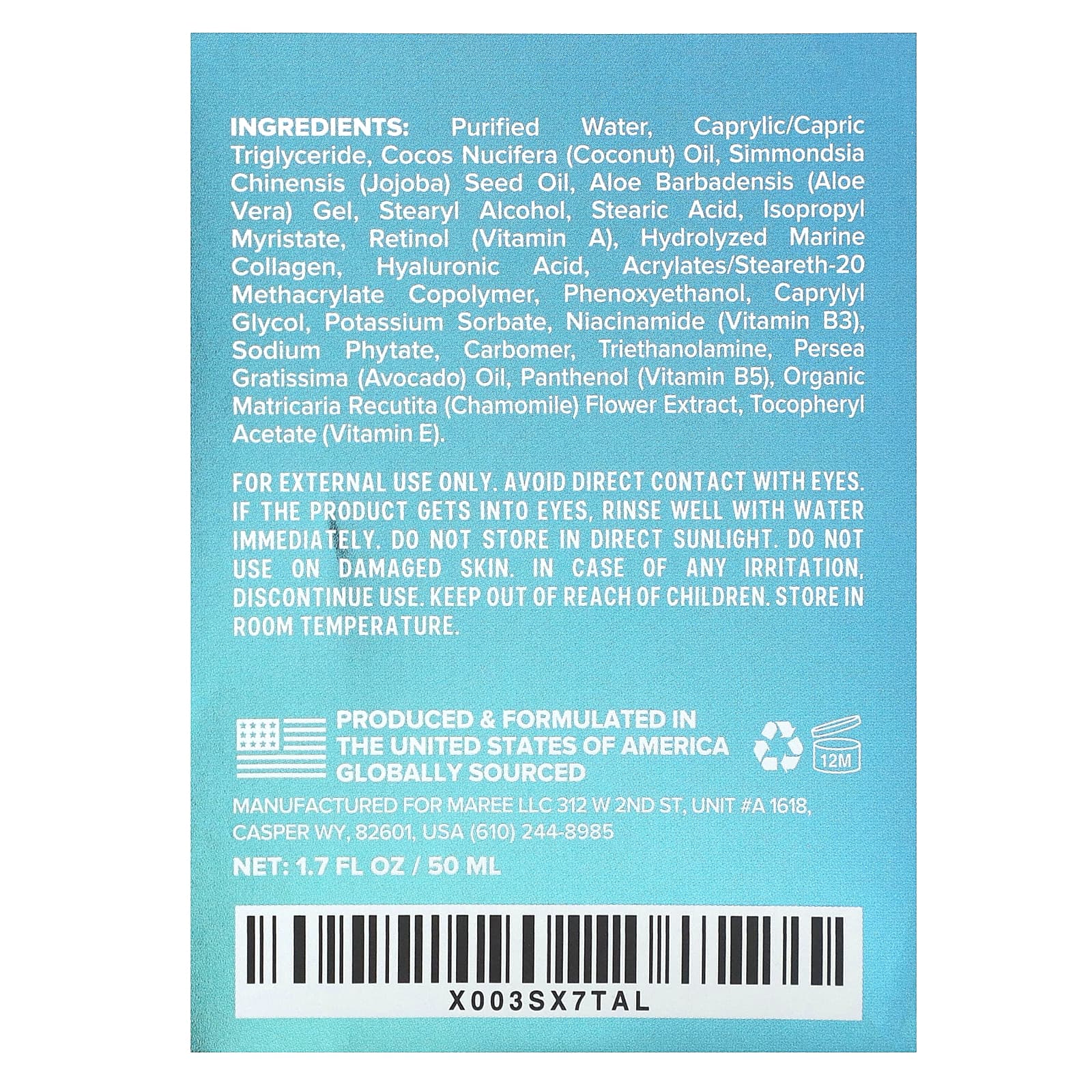Очищенная вода, каприловый/каприновый триглицерид, кокосовое масло (Cocos nucifera), масло семян жожоба (Simmondsia chinensis), гель алоэ вера (Aloe barbadensis), стеариловый спирт, стеариновая кислота, изопропил миристат, ретинол (витамин A), гидролизованный морской коллаген, гиалуроновая кислота, сополимер акрилатов/стеарет-20 метилакрилата, феноксиэтанол, каприлилгликоль, сорбат калия, никотинамид (витамин B3), фитат натрия, карбомер, триэтаноламин, масло авокадо (Persea gratissima), пантенол (витамин B5), органический экстракт цветков ромашки (Matricaria recutita), токоферилацетат (витамин E).