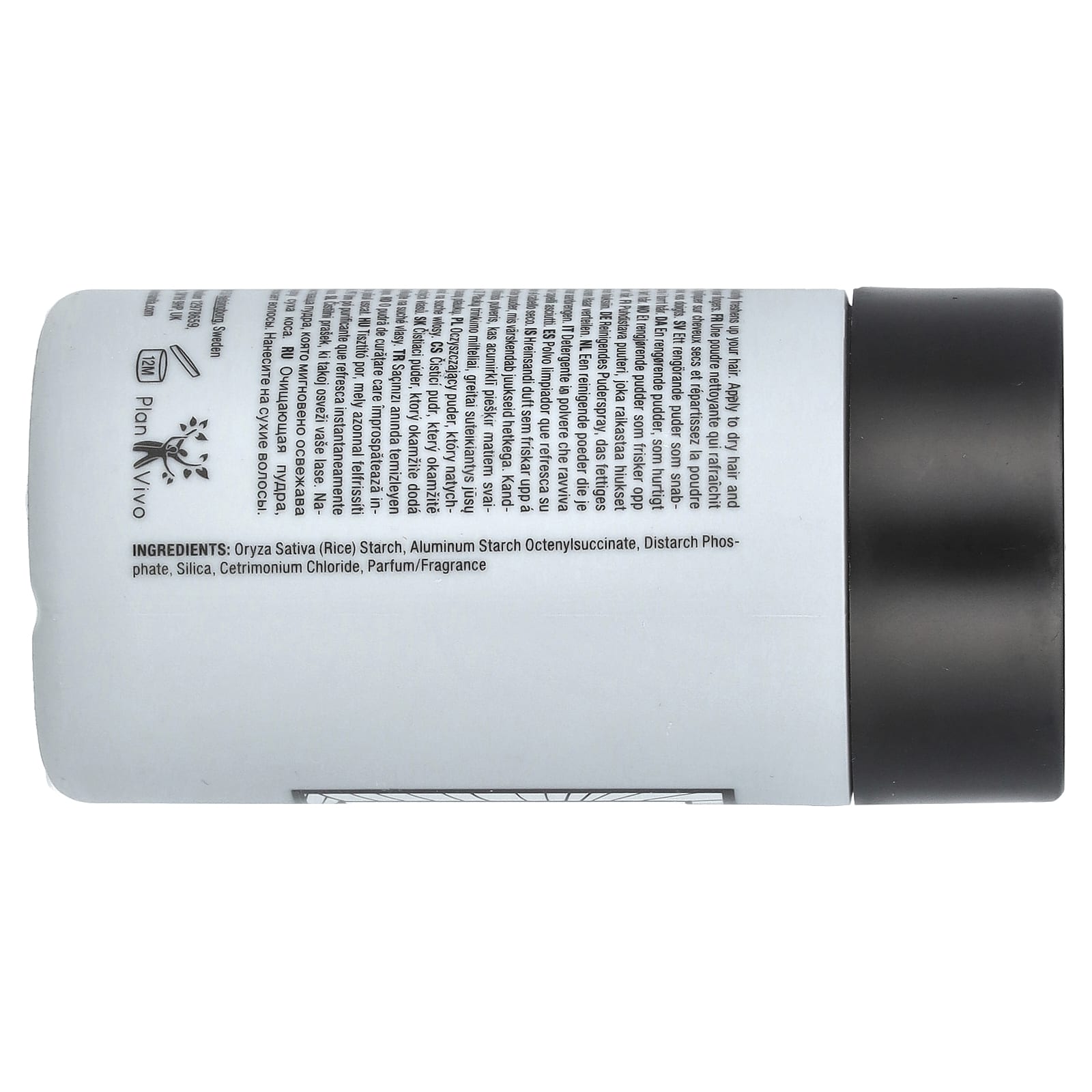 Oryza sativa (рисовый) крахмал, алюминия крахмал октенилсукцинат, дикрахмалфосфат, диоксид кремния, цетримония хлорид, парфюмерная композиция.