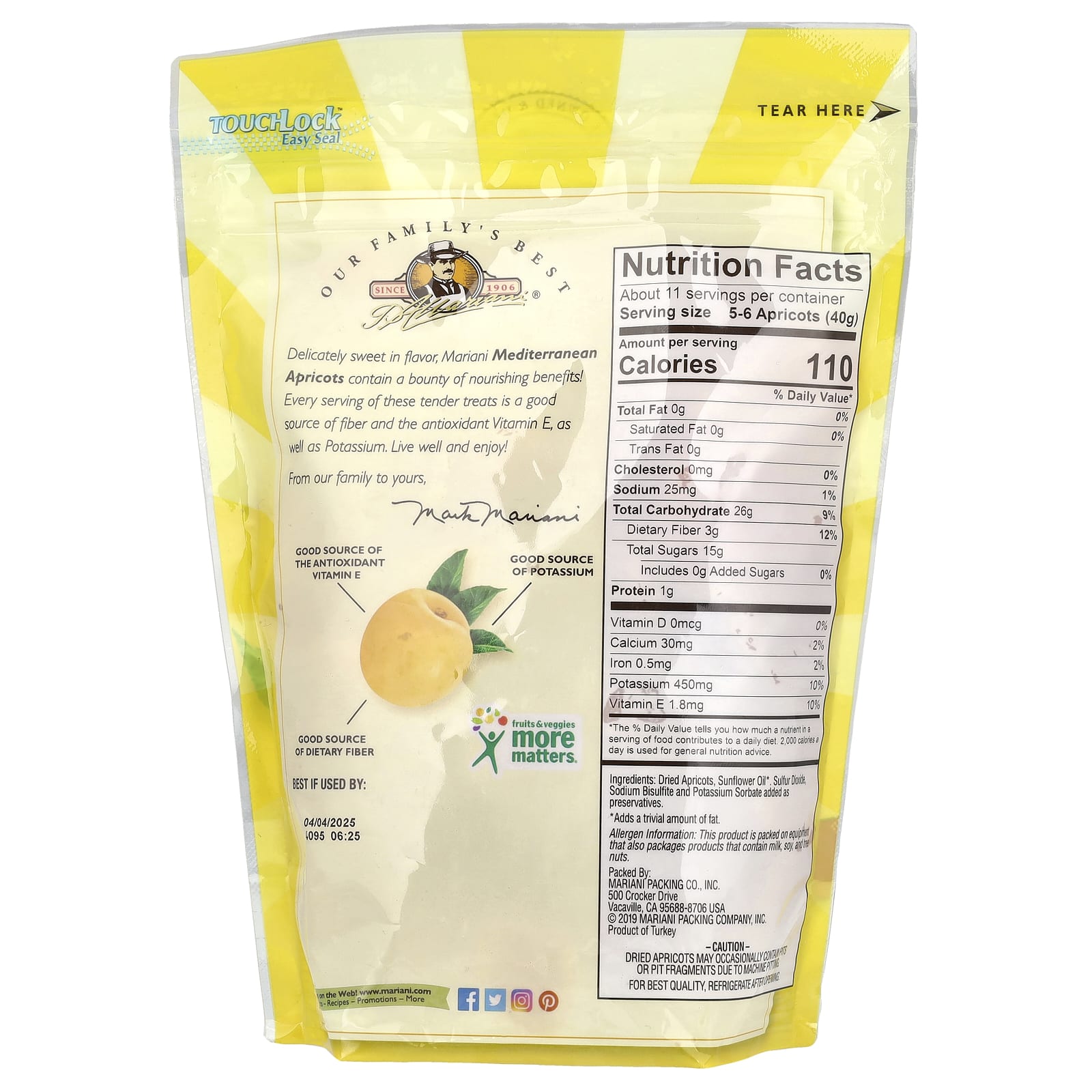 Средиземноморские абрикосы Mariani с нежным сладким вкусом обладают множеством питательных свойств! Каждая порция этого нежного лакомства является хорошим источником клетчатки и антиоксиданта, витамина Е, а также калия. Наслаждайтесь жизнью! От нашей семьи — вашей.