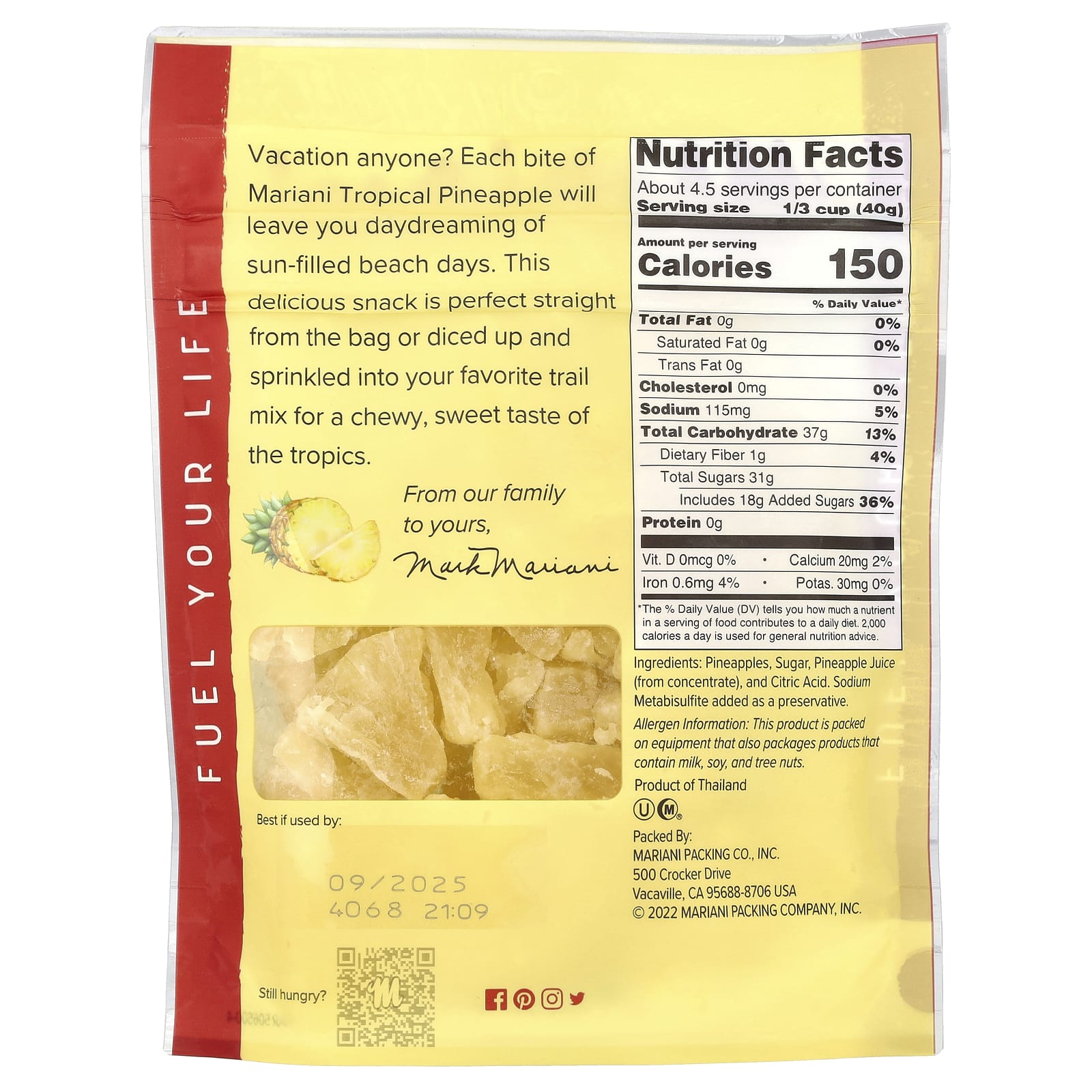 Кому-нибудь в отпуск? Каждый кусочек тропического ананаса Mariani оставит вас в мечтах о солнечных пляжных днях. Эта восхитительная закуска идеально подходит для приготовления прямо из упаковки или нарезанной кубиками и добавленной в вашу любимую смесь для получения сладкого тропического вкуса.