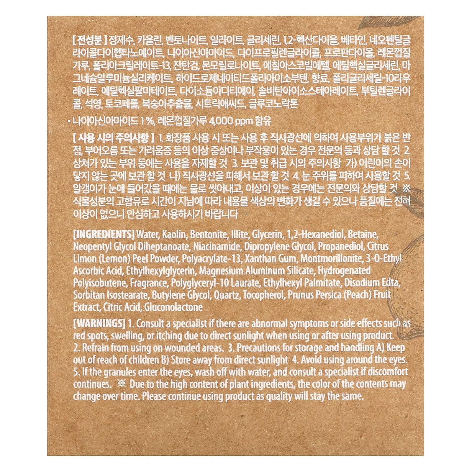 Вода, каолин, бентонит, иллит, глицерин, 1,2-гександиол, бетаин, неопентилгликоль дигептаноат, никотинамид, дипропиленгликоль, пропандиол, порошок из цедры лимона (Citrus limon), полиакрилат-13, ксантановая камедь, монтмориллонит, 3-0-этил-аскорбиновая кислота, этилгексилглицерин, алюмосиликат магния, гидрогенизированный полиизобутен, отдушка, полиглицерил-10 лаурат, этилгексил пальмитат, двунатриевая ЭДТК, сорбитан изостеарат, бутиленгликоль, кварц, токоферол, экстракт персика (Prunus persica), лимонная кислота, глюконолактон.