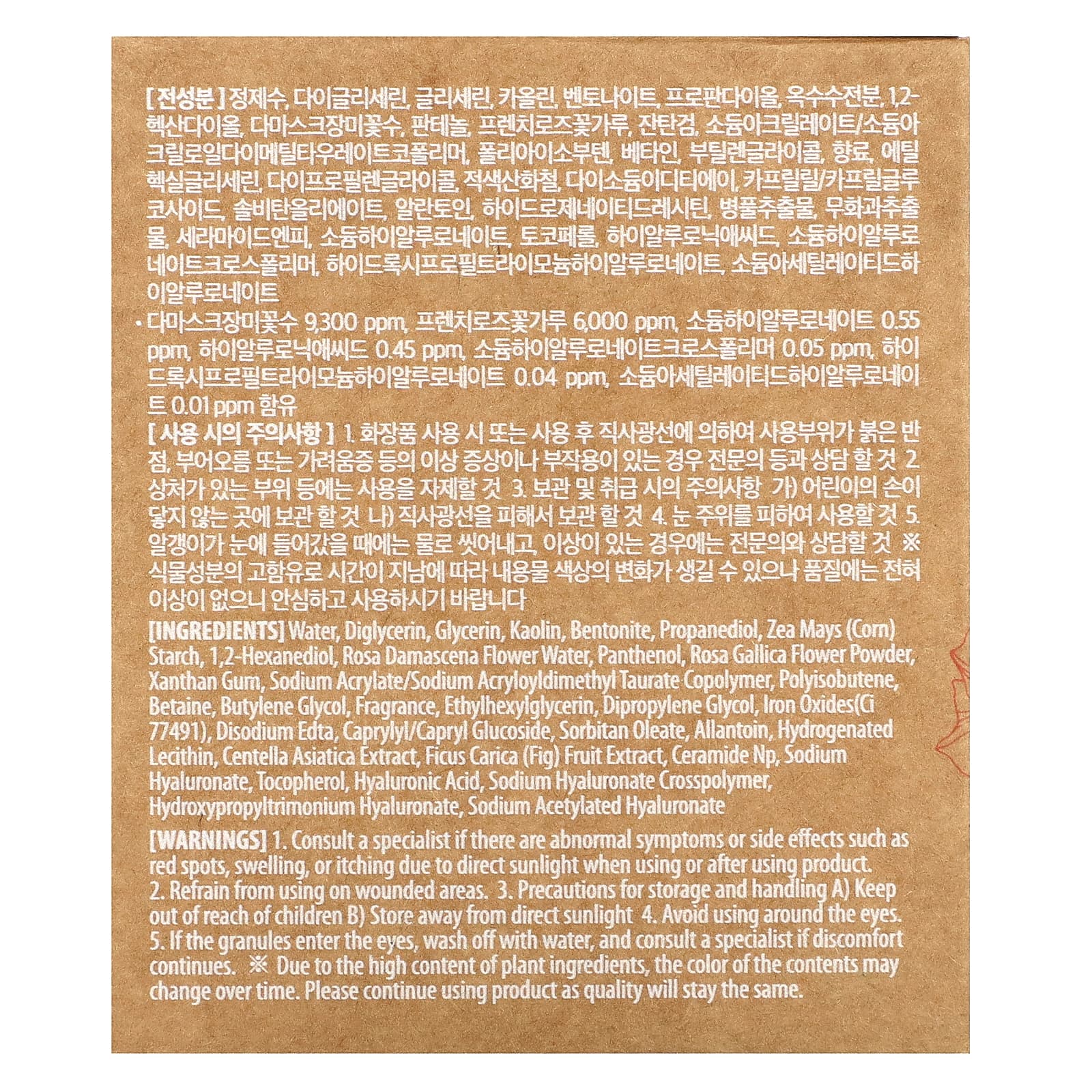 Вода, диглицерин, глицерин, каолин, бентонит, пропандиол, кукурузный крахмал (Zea mays), 1,2-гександиол, вода из цветков дамасской розы (Rosa damascena), пантенол, порошок из цветков шиповника французского (Rosa gallica), ксантановая камедь, сополимер акрилата/акрилоилдиметил таурат натрия, полиизобутен, бетаин, бутиленгликоль, отдушка, этилгексилглицерин, дипропиленгликоль, оксид железа (CI 77491), двунатриевая ЭДТК, каприлил/каприл глюкозид, сорбитанолеат, аллантоин, гидрогенизированный лецитин, экстракт готу колы (Centella asiatica), экстракт плодов инжира (Ficus carica), керамид NP, гиалуронат натрия, токоферол, гиалуроновая кислота, кроссполимер гиалуроната натрия, гиалуронат гидроксипропилтримония, ацетилированный гиалуронат натрия.