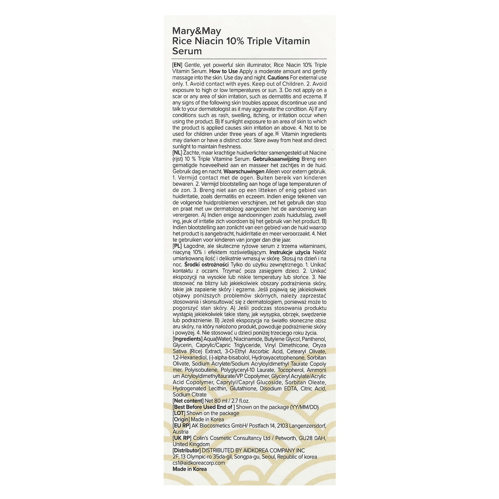 Вода, никотинамид, бутиленгликоль, пантенол, глицерин, каприловый/каприновый триглицерид, винил диметикон, экстракт риса (Oryza sativa), 3-0-этил аскорбиновая кислота, цетеарил оливат, 1,2-гександиол, (-) - альфа-бисаболол, гидроксиацетофенон, сорбитан оливат, натрий акрилат/натрий акрилоилдиметилтаурат сополимер, полиизобутен, полиглицерил-10 лаурат, токоферол, аммоний акрилоилдиметилтаурат/ВП сополимер, сополимер глицерил акрилата/акриловой кислоты, каприлил/каприл глюкозид, сорбитанолеат, гидрогенизированный лецитин, глутатион, двунатриевая ЭДТК, лимонная кислота, цитрат натрия.
