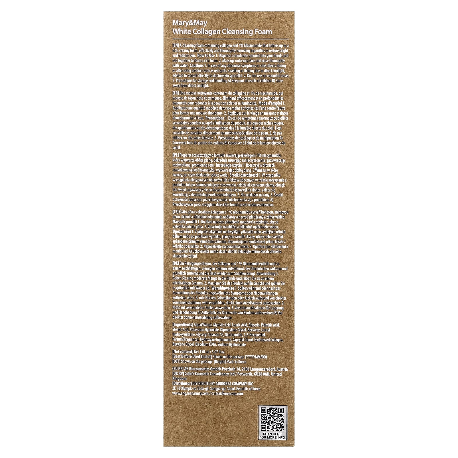 Вода, миристиновая кислота, лауриновая кислота, глицерин, пальмитиновая кислота, стеариновая кислота, гидроксид калия, дипропиленгликоль, пчелиный воск, лаурил гидроксисултаин, глицерил стеарат эмульгирующий, никотинамид, 1,2-гександиол, парфюмерная композиция, гидроксиацетофенон, каприлилгликоль, гидролизованный коллаген, бутиленгликоль, двунатриевая ЭДТК, гиалуронат натрия.